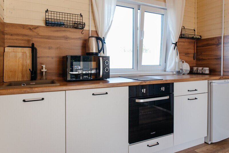 Кухня укомплектована духовкой, плитой, микроволновкой, чайником и всей необходимой посудой, есть запас соли, сахара, муки, вермишели и растительного масла. Есть стиральная машина.