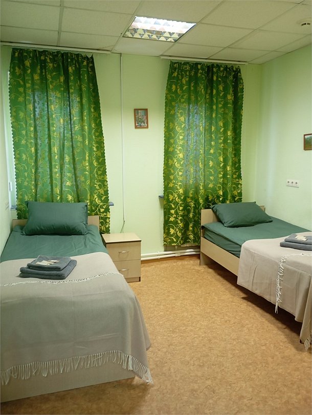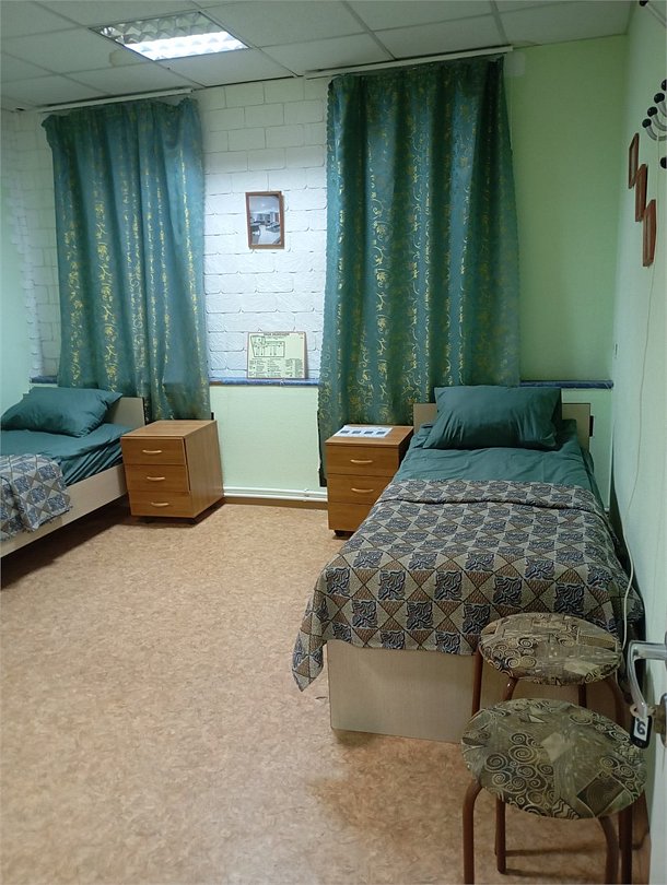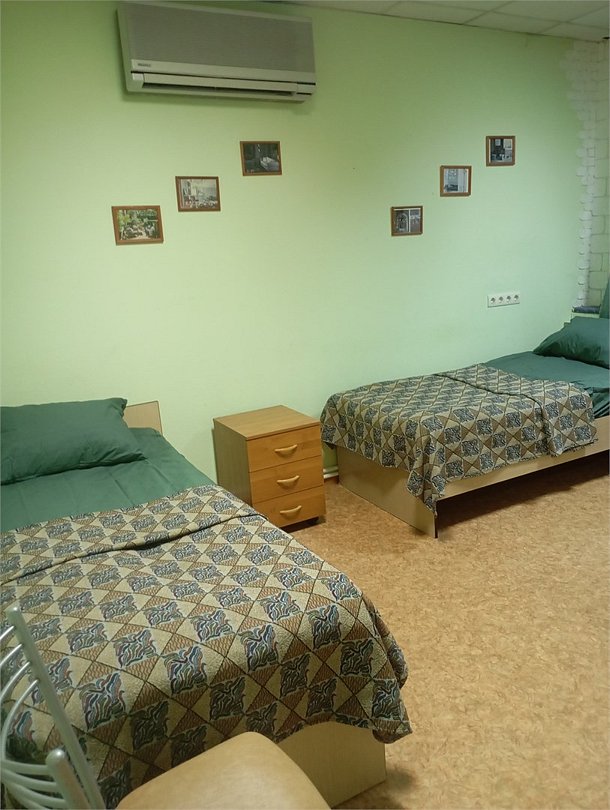 Двухместный гостиничный номер обустроен: две кровати, тумбы для личных вещей, шкаф и вешалки для одежды, стол и стулья, телевизор, кондиционер и точка доступа Wi-Fi.Услуги и удобства