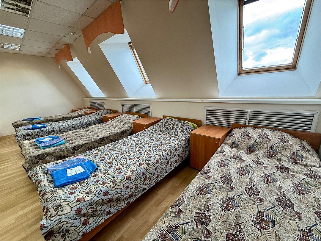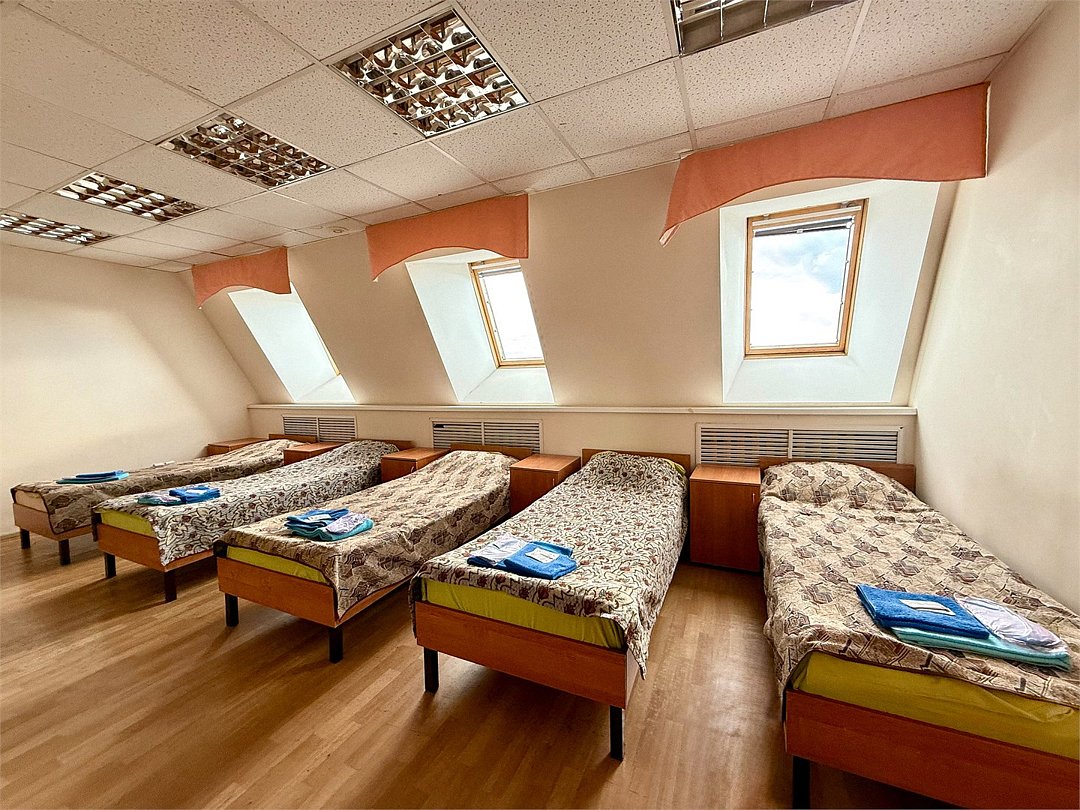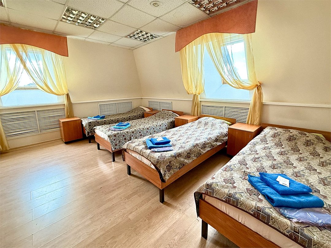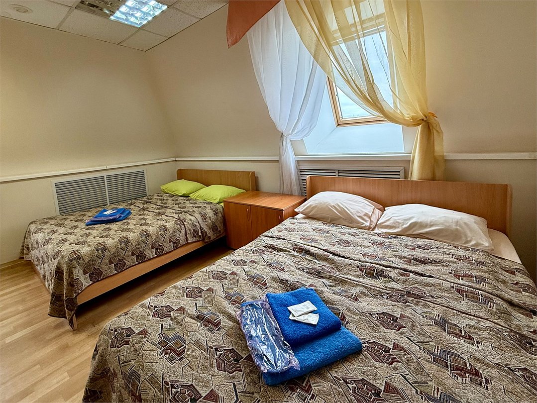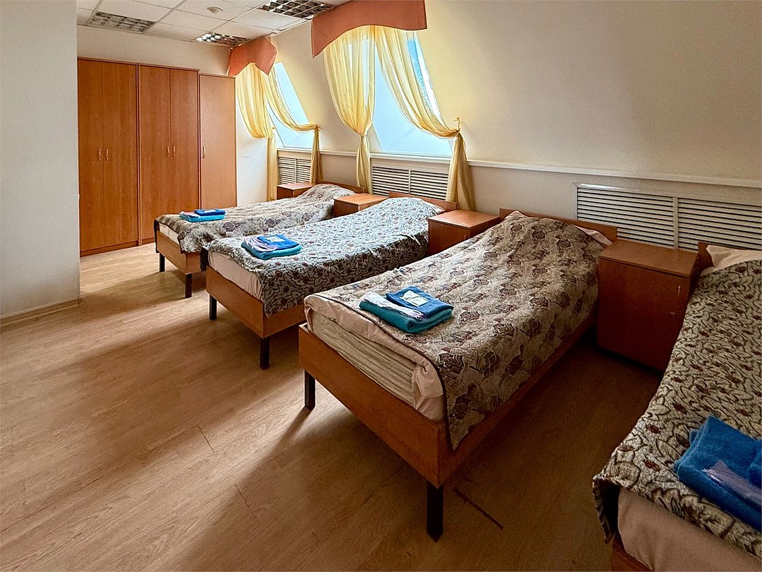 Четырехместный номер Стандарт с четырьмя кроватями 160х200 с удобствами на этаже. Номер оснащен холодильником, столом со стулом, шкафом, полкой для обуви и зеркалом.Услуги и удобства