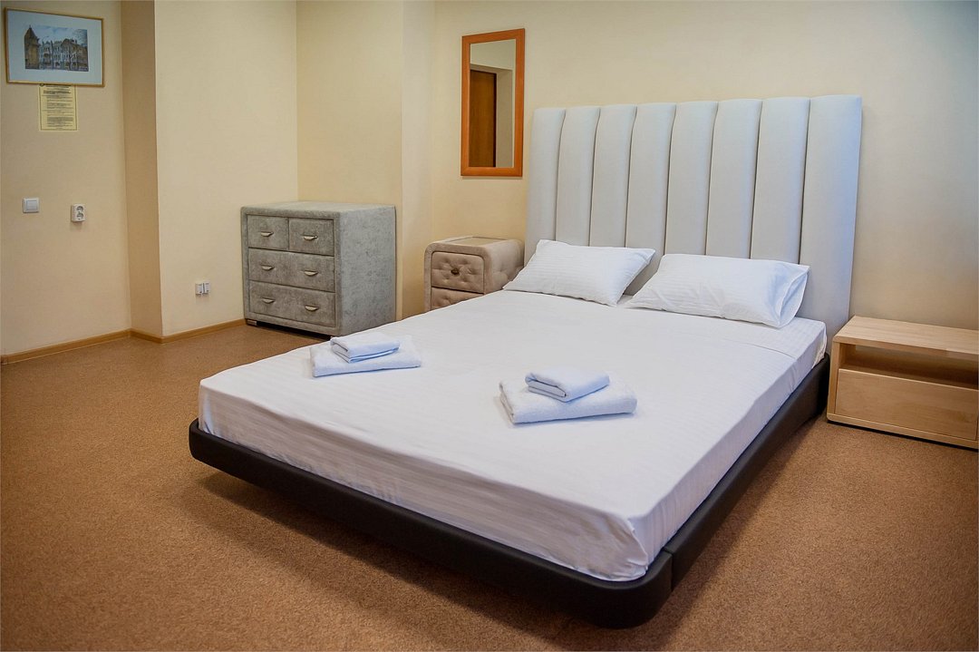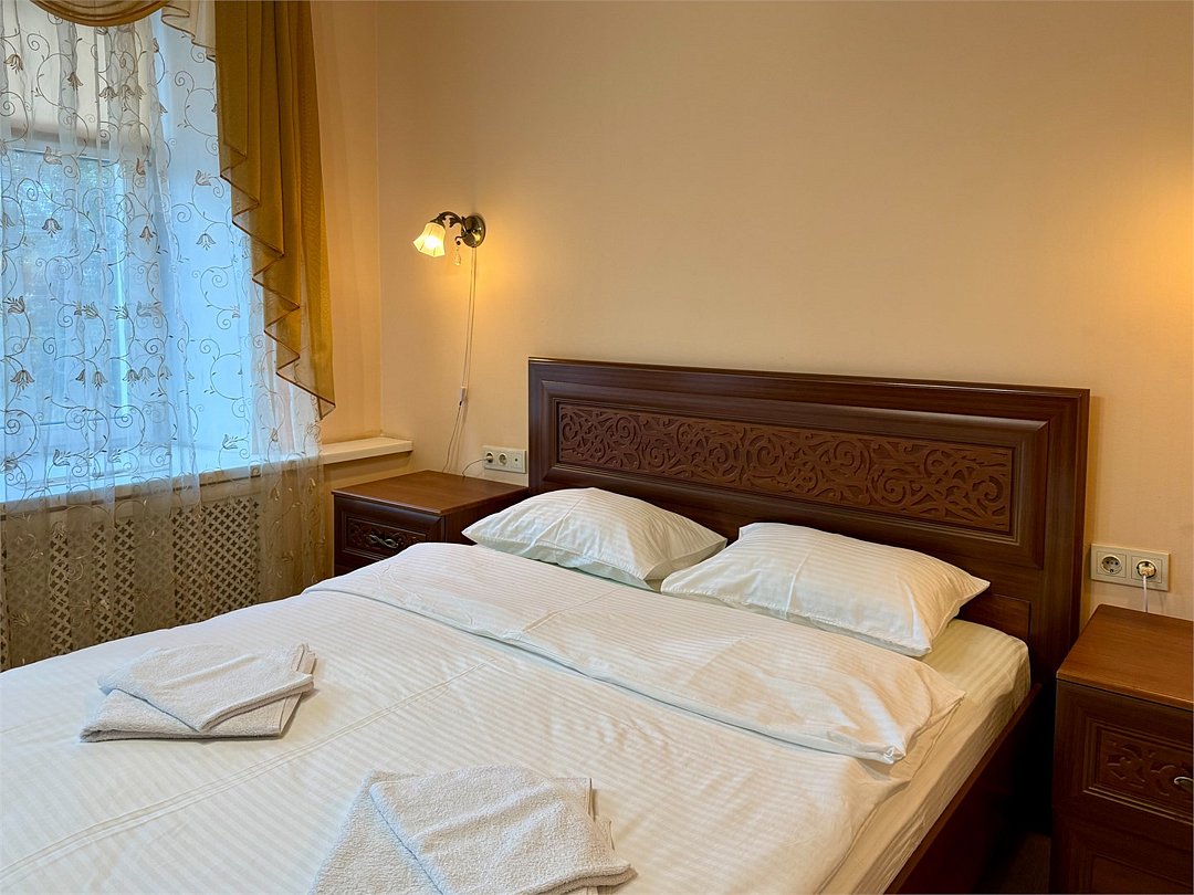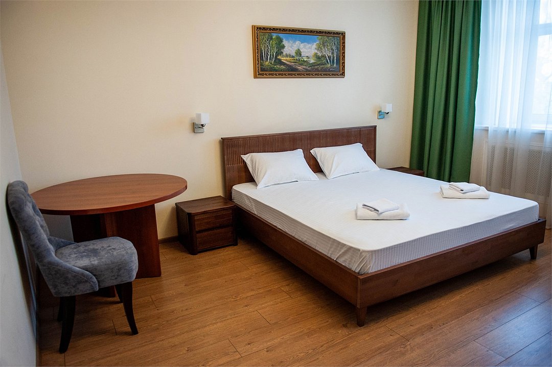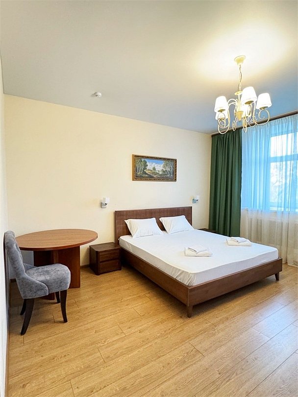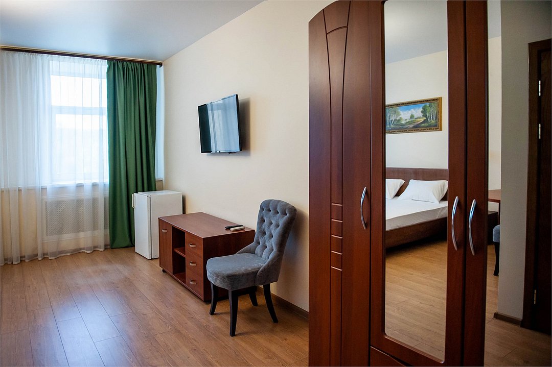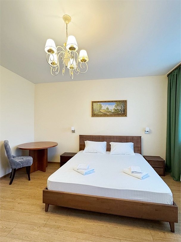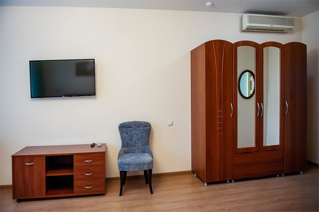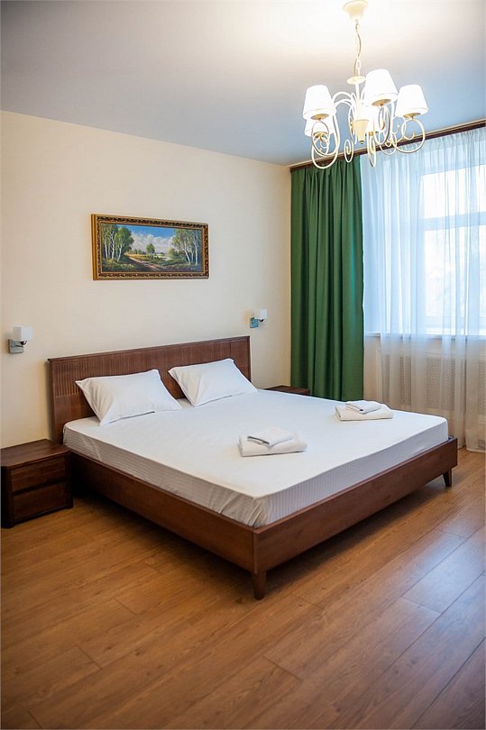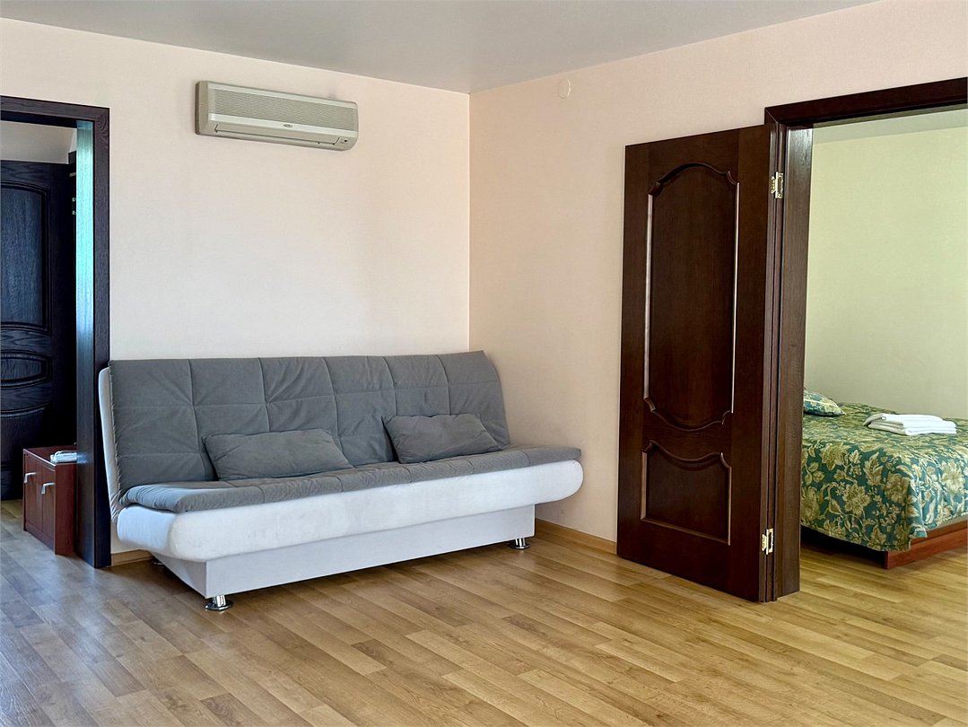 Уютный двухместный номер, разделённый на спальную и гостиную зоны, идеально подходит для комфортного отдыха. Площадь номера — 46 м². В спальной зоне: -Просторная кровать (170x200) -Прикроватные тумбы -Шкаф для одежды -Телевизор -Кондиционер В гостиной зоне: -Раскладной диван -Журнальный столик -Телевизор -Чайник -Набор необходимой посуды В прихожей: -Платяной шкаф -Холодильник В ванной комнате: -Душевая кабина -Туалет -Фен Бесплатные гигиенические принадлежности: мыло, шампунь, гель для душа, комплект полотенец, халат, одноразовые тапочки Периодичность смены постельного белья — раз в три дня, что гарантирует вам комфортное и свежее пребывание.Услуги и удобства