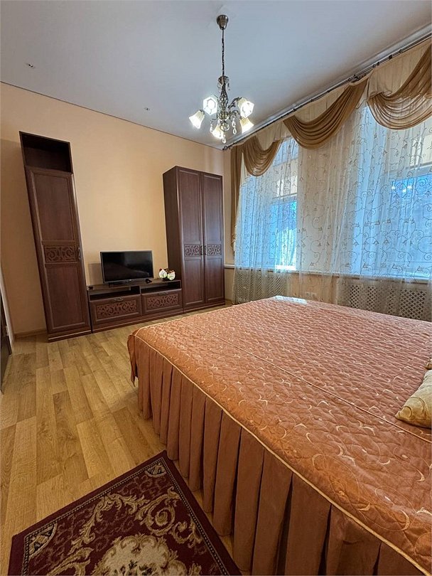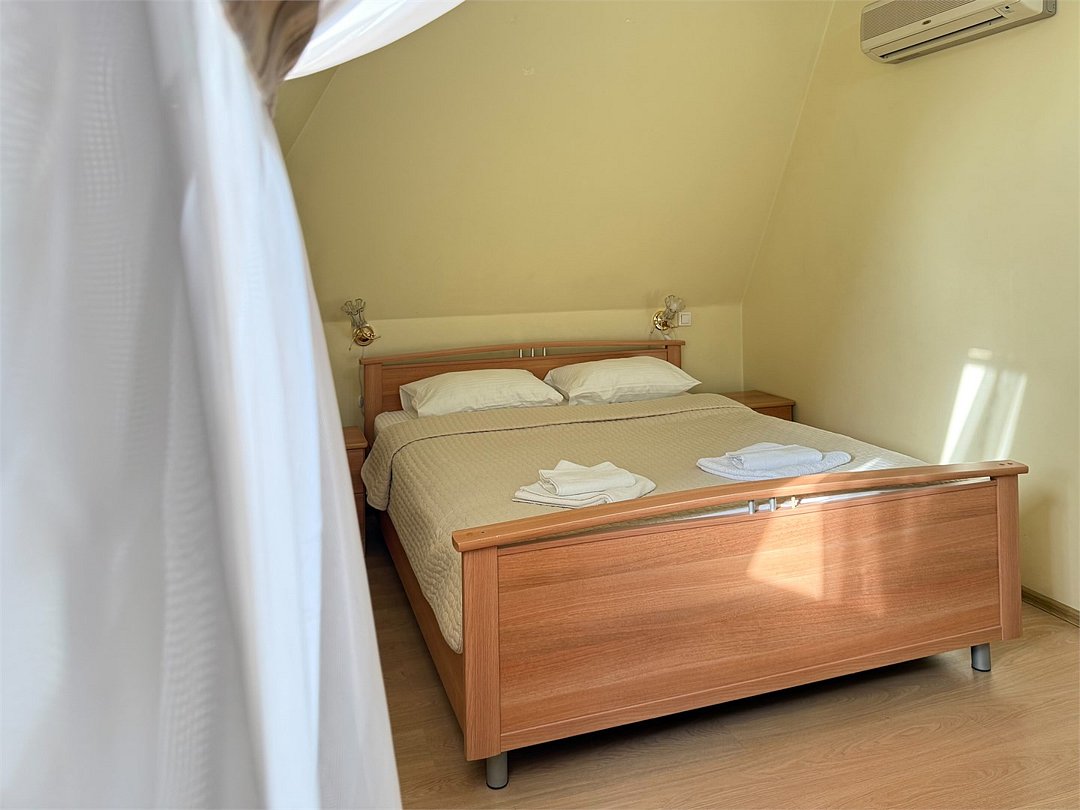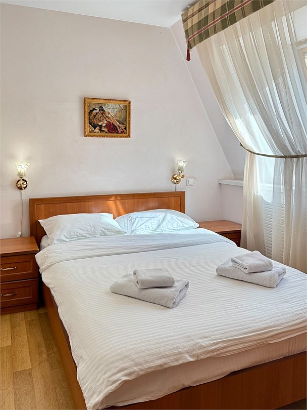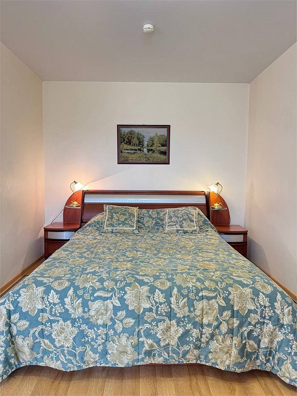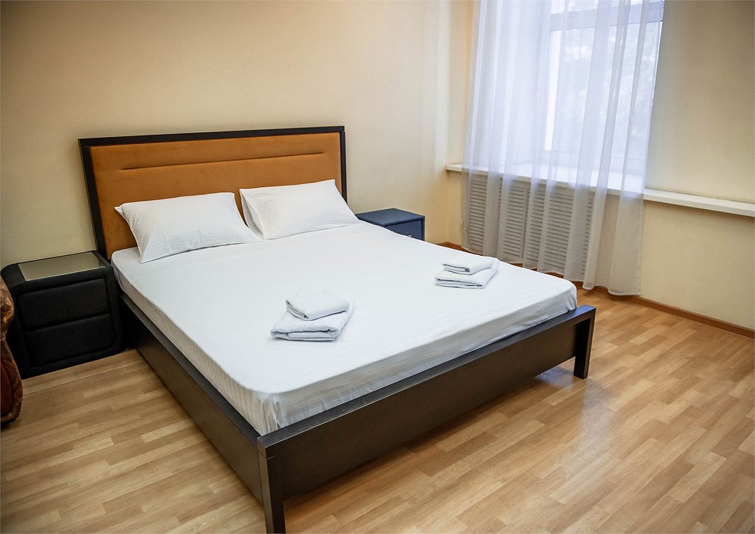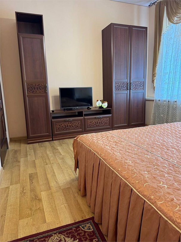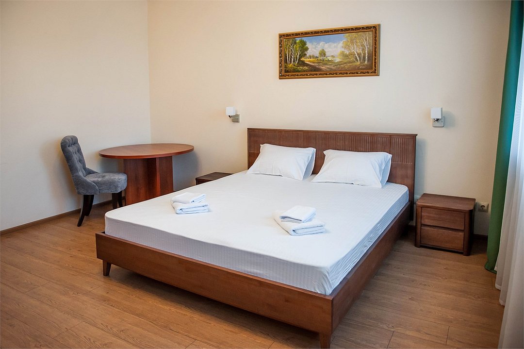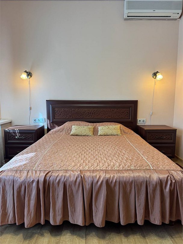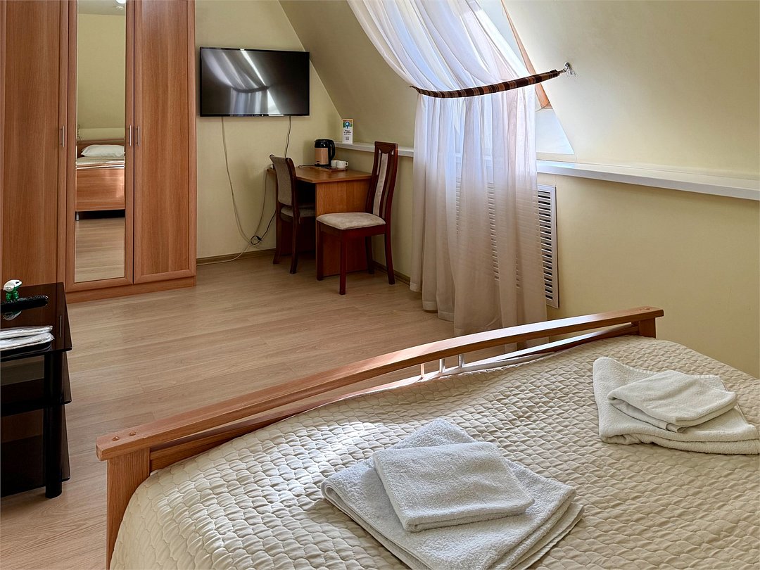 Уютный двухместный номер, разделённый на спальную и гостиную зоны, идеально подходит для комфортного отдыха. Площадь номера — 46 м². В спальной зоне: -Просторная кровать (170x200) -Прикроватные тумбы -Шкаф для одежды -Телевизор -Кондиционер В гостиной зоне: -Раскладной диван -Журнальный столик -Телевизор -Чайник -Набор необходимой посуды В прихожей: -Платяной шкаф -Холодильник В ванной комнате: -Душевая кабина -Туалет -Фен Бесплатные гигиенические принадлежности: мыло, шампунь, гель для душа, комплект полотенец, халат, одноразовые тапочки Периодичность смены постельного белья — раз в три дня, что гарантирует вам комфортное и свежее пребывание.Услуги и удобства