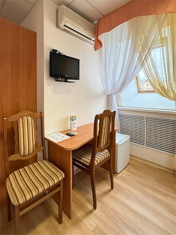 телевизор, Wi-Fi, интернет, кондиционер, односпальная кровать, тумбы, стулья, шкаф для одежды, вид на город, общая ванная комната, вид во двор, стул, стол, санузел на этаже, мини-холодильник, душ на этажеВ месте в номере