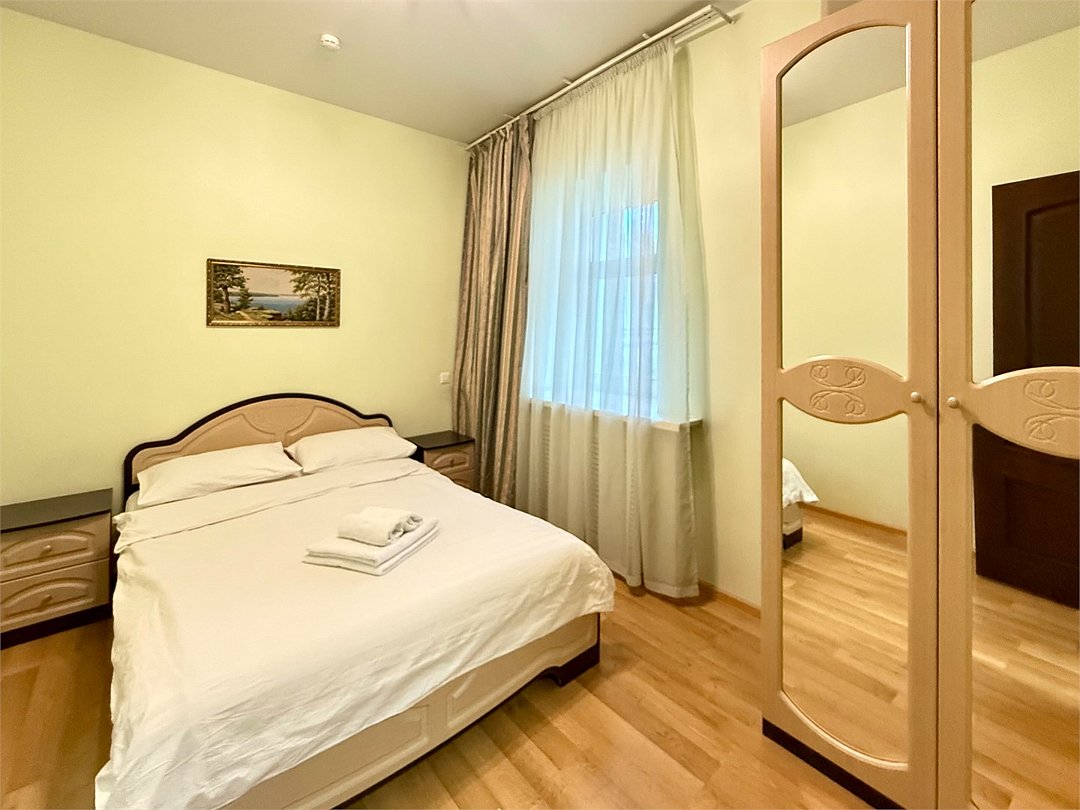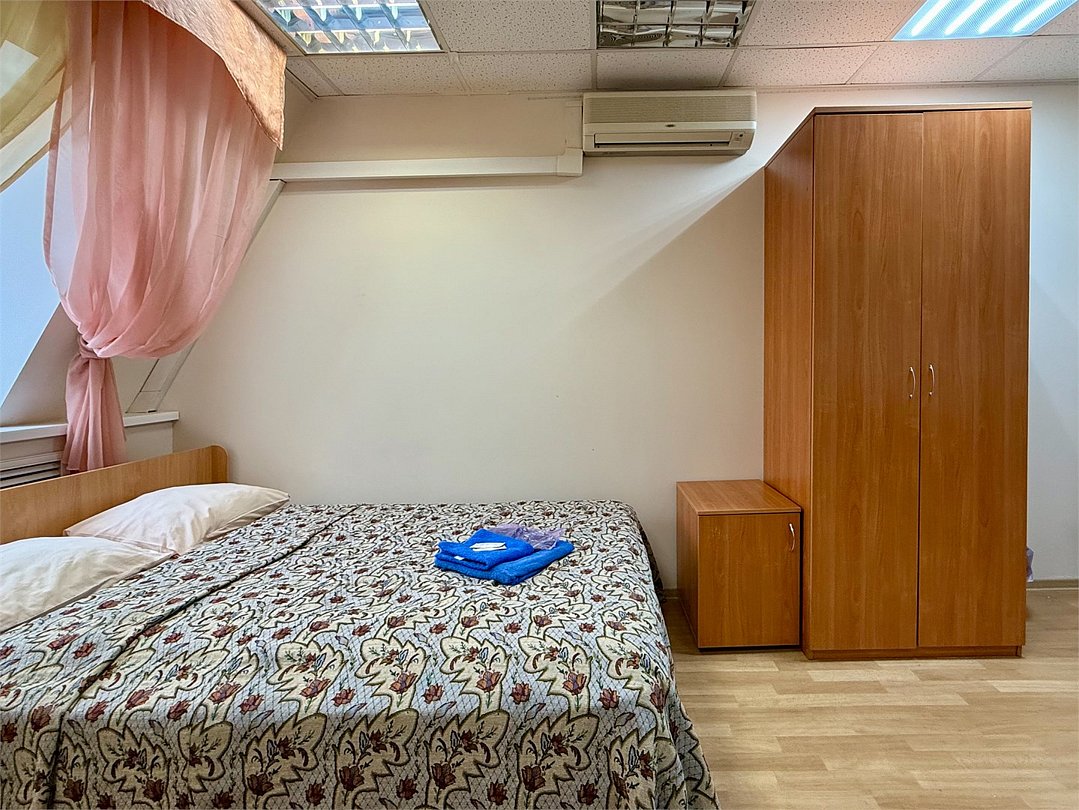 Wi-Fi, интернет, кондиционер, тапочки, двуспальная кровать, стулья, шкаф для одежды, зеркало, вид на город, общая ванная комната, вид во двор, стул, стол, санузел на этаже, мини-холодильник, душ на этаже, туалетные принадлежности премиум-классаВ гостиничном номере
