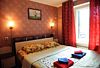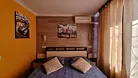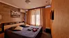 В номере вас ждет уютная двуспальная кровать с ортопедическим матрасом и две прикроватные тумбочки, гардероб, обеденный стол со стульями, а также телевизор.