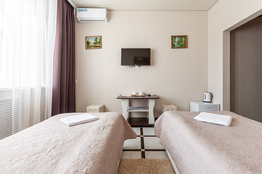 телевизор, Wi-Fi, кондиционер, настольные лампы, фен, ванная комната, душевая кабина, банные полотенца, тапочки, косметические средства, две односпальные кровати, тумбы, стулья, чайник, унитаз, вид во двор, стол, туалетные средства, мини-холодильник, шкаф-купеВ гостиничном номере
