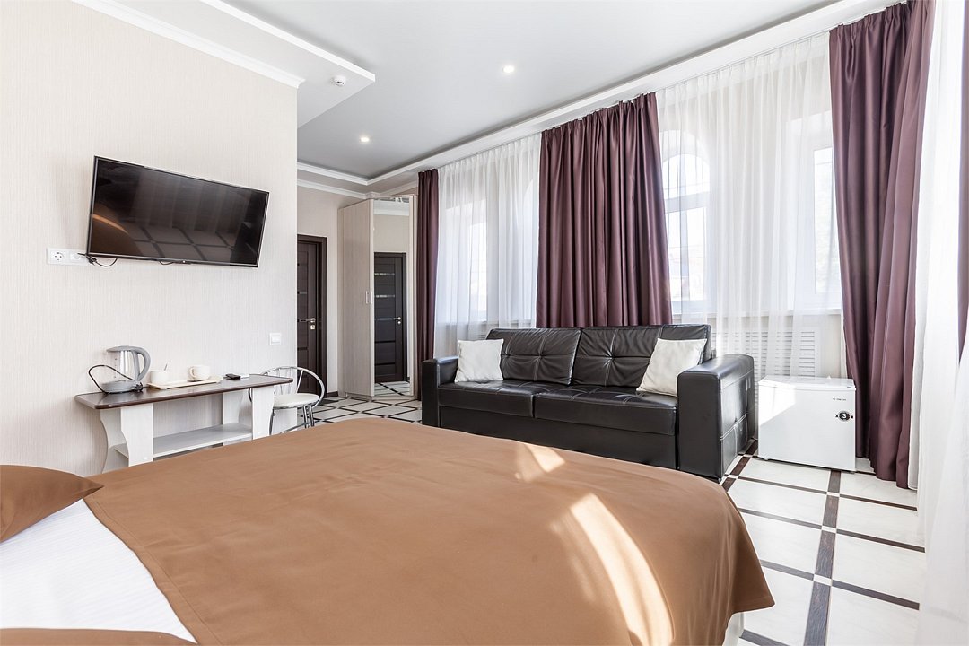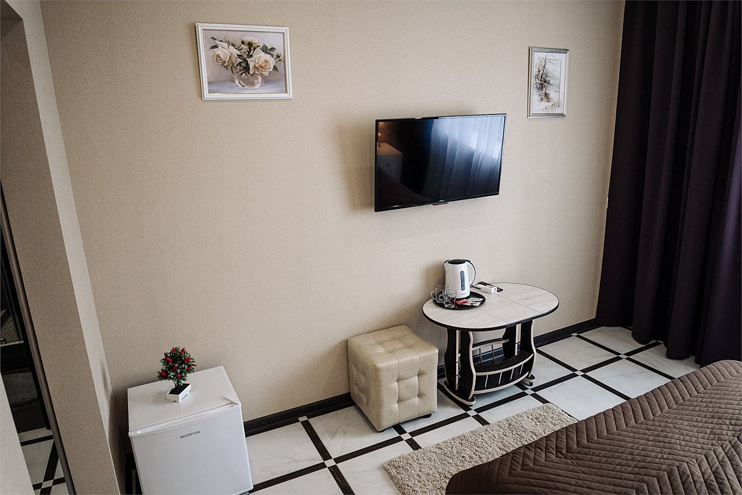 телевизор, Wi-Fi, холодильник, фен, душевая кабина, банные полотенца, косметические средства, двуспальная кровать, тумбы, стулья, чайник, вид во двор, стол, диван-кровать, шкаф-купеВ гостиничном номере