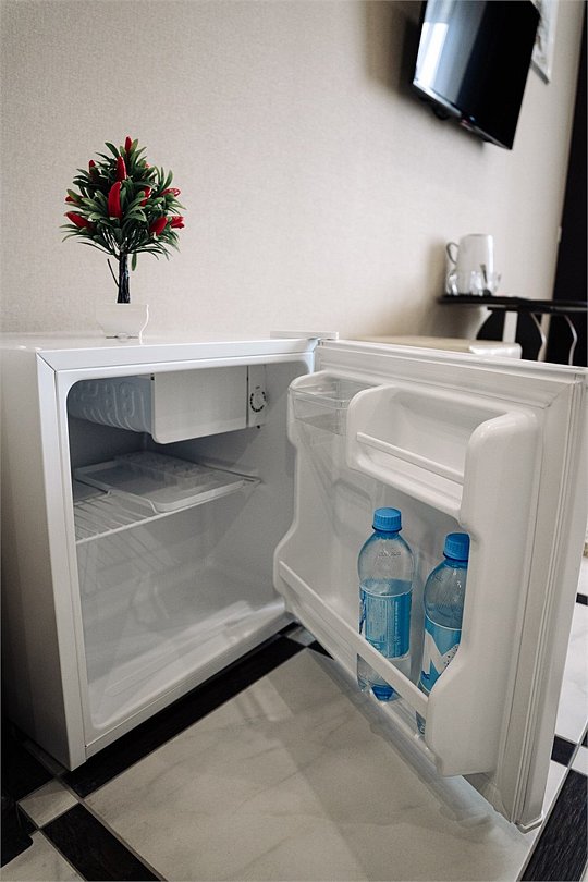 телевизор, Wi-Fi, холодильник, фен, душевая кабина, банные полотенца, тапочки, косметические средства, двуспальная кровать, тумбы, стулья, чайник, вид во двор, стол, туалетные средства, раскладное кресло, шкаф-купеВ гостиничном номере