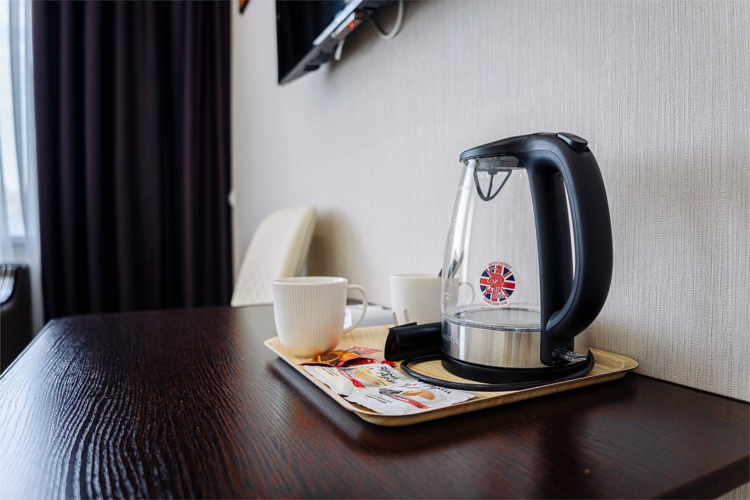 телевизор, Wi-Fi, холодильник, банные полотенца, тапочки, косметические средства, двуспальная кровать, тумбы, стулья, шкаф для одежды, чайник, вид во двор, стол, туалетные средстваВ гостиничном номере