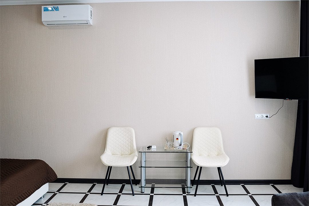 телевизор, Wi-Fi, холодильник, фен, плита для приготовления пищи, душевая кабина, банные полотенца, косметические средства, двуспальная кровать, тумбы, стулья, шкаф для одежды, кухня, чайник, унитаз, вид во двор, стол, туалетные средства, сплит-система, раскладной диванВ гостиничном номере