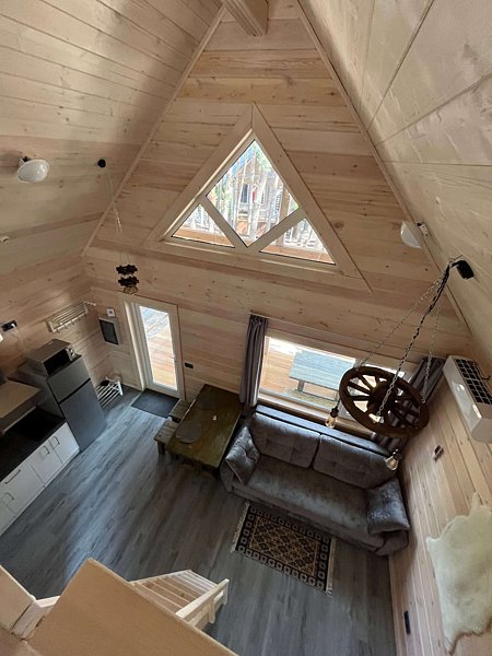 Двухместный с дополнительным 2-х спальным местом на втором уровне/антресоли. Веранда, 1 спальня, гостиная, совмещенная с кухней, второй уровень/антресоль с 2-х спальным матрасом, с/у.