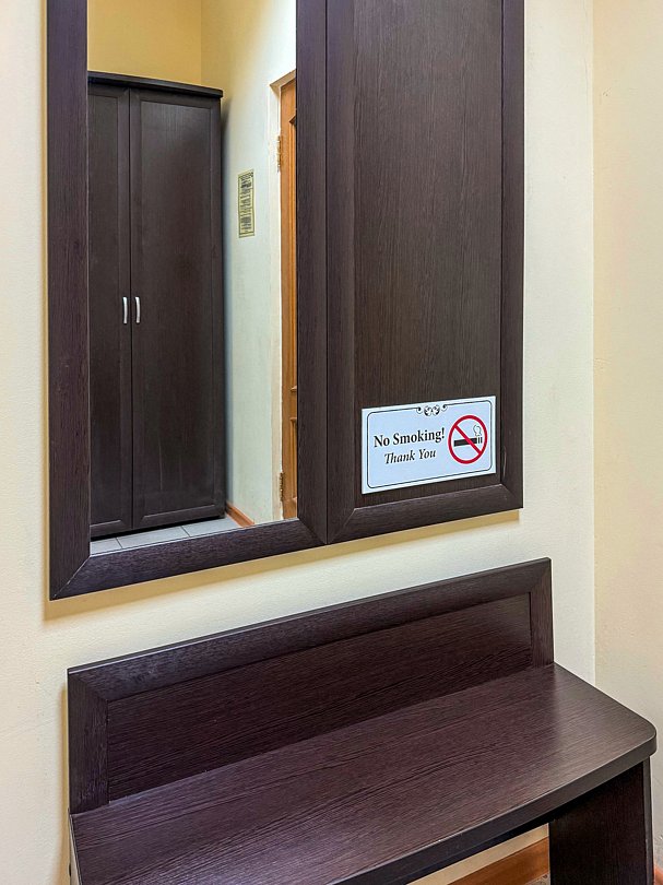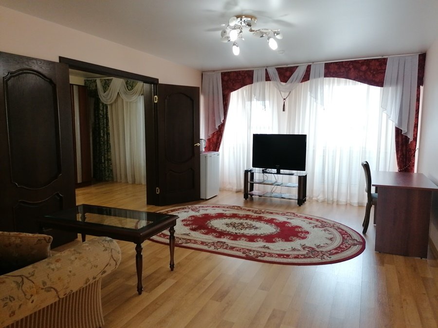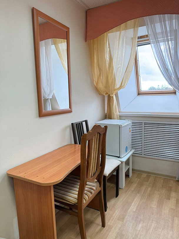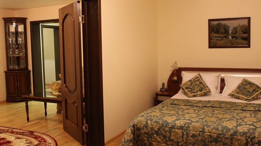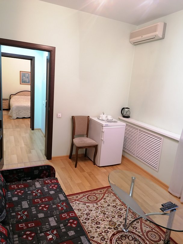 В спальной зоне одна большая кровать (170 х 200), прикроватные тумбы, шкаф для одежды, телевизор, телефон, кондиционер, установлен бесплатный сейф. В гостиной — раскладной диван, журнальный столик, письменный стол, телевизор. В прихожей — шкаф с набором необходимой посуды, холодильник, чайник.