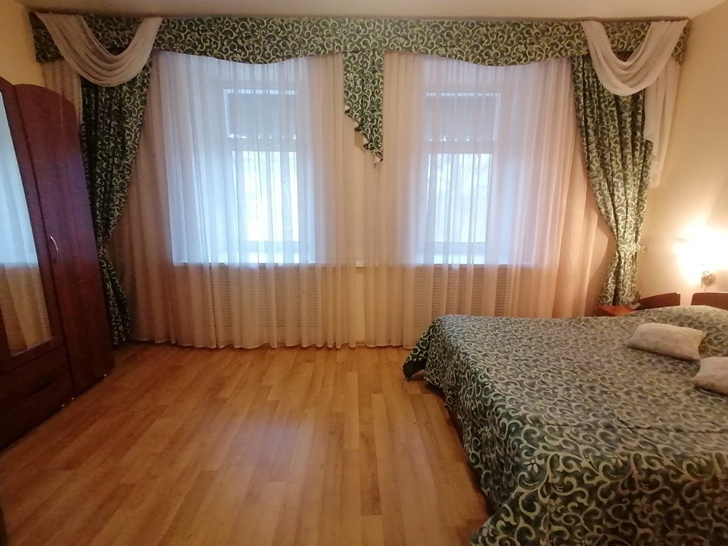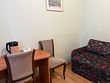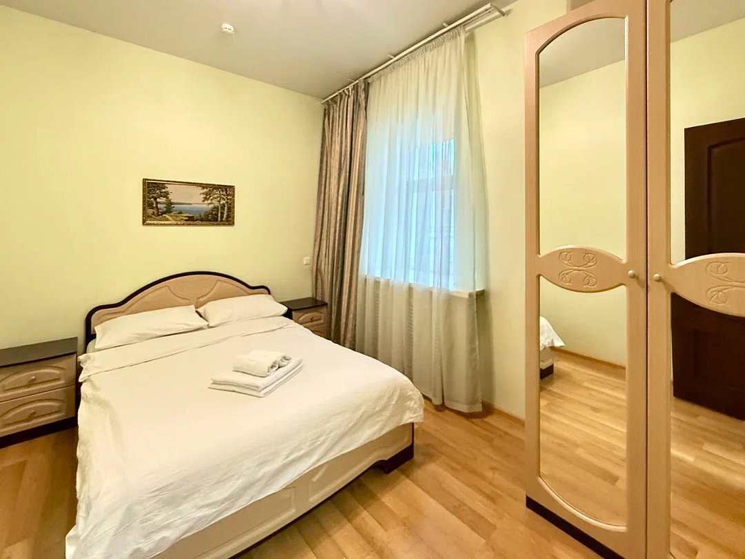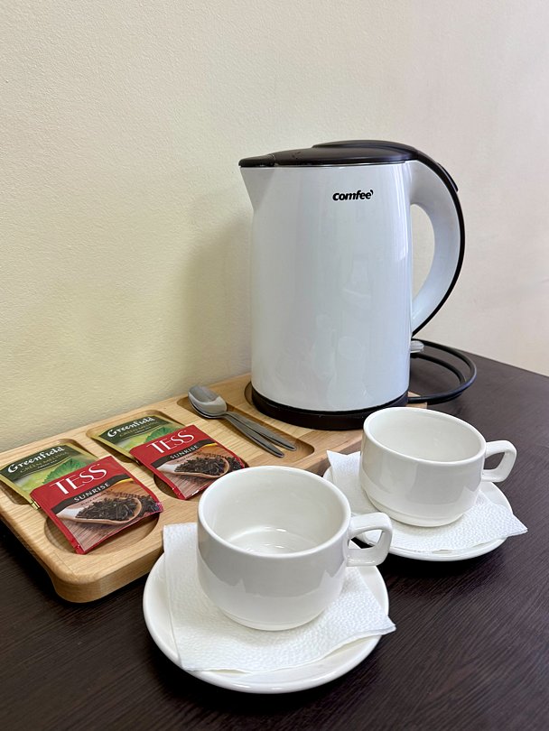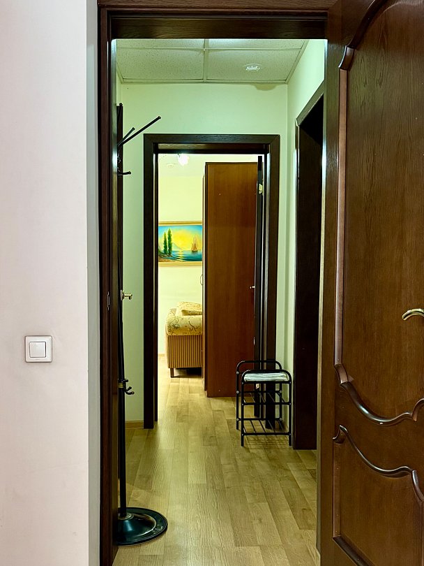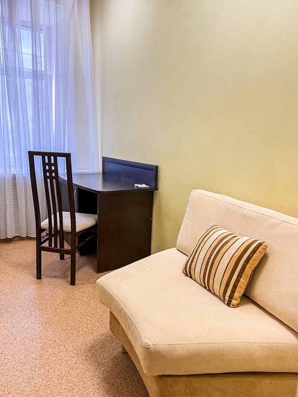 В спальной зоне одна большая кровать (170 х 200), прикроватные тумбы, шкаф для одежды, телевизор, телефон, кондиционер. В гостиной — раскладной диван, журнальный столик, телевизор, чайник, набор необходимой посуды. В прихожей платяной шкаф, холодильник.