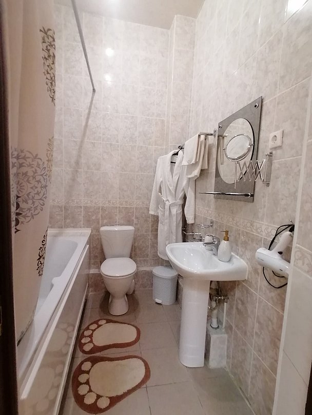 В ванной комнате: душ, туалет, фен, бесплатные гигиенические принадлежности: мыло, шампунь, гель для душа, комплект полотенец, махровый халат, одноразовые тапочки. Все номера оборудованы кондиционерами.