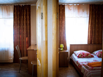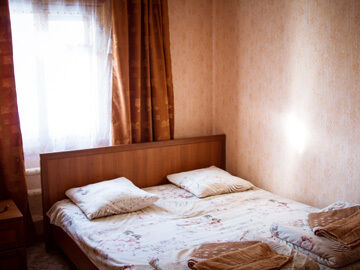 Однокомнатный номер, 2-спальная кровать, душ, с/у совмещенный, стол, стулья, ТВ, выход в мини-зал для банкета.