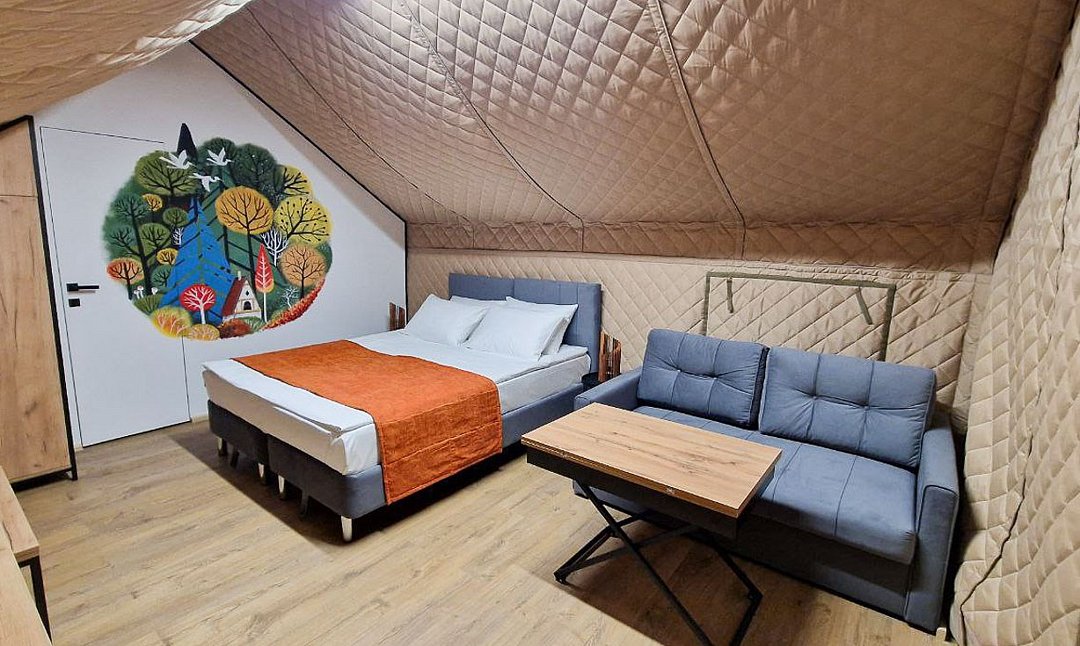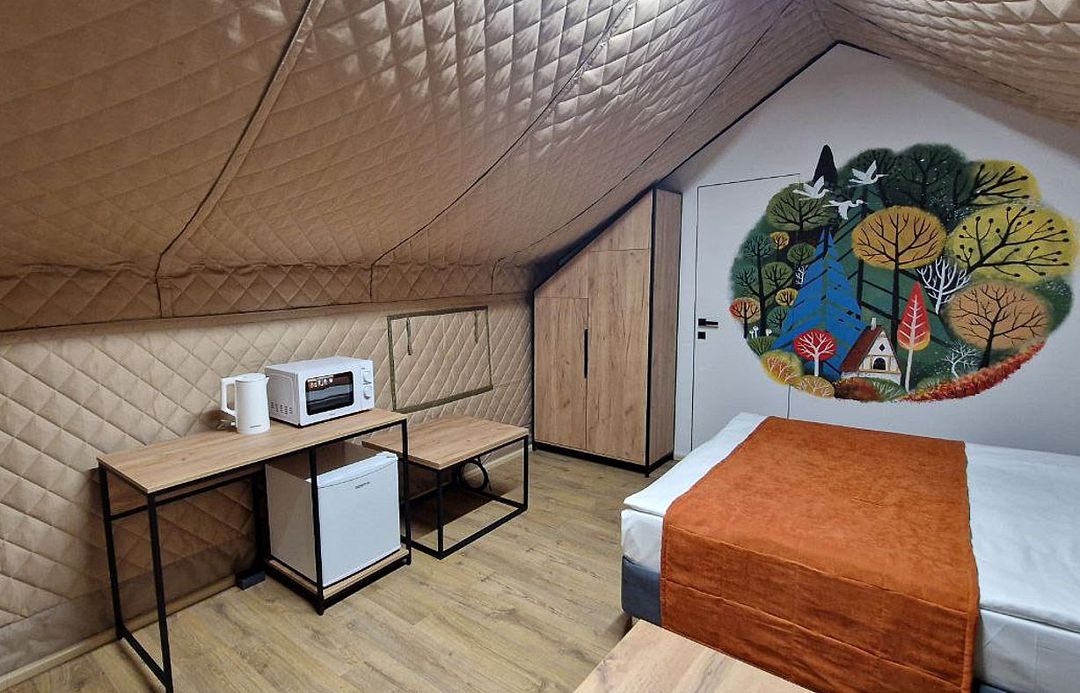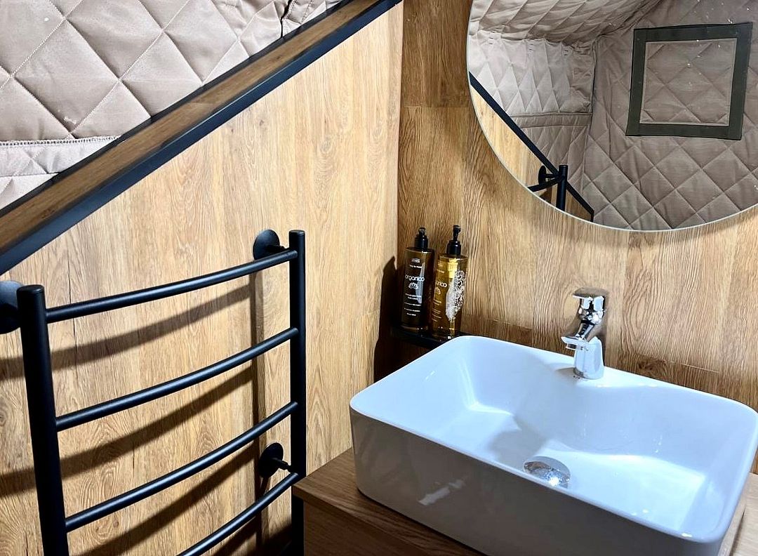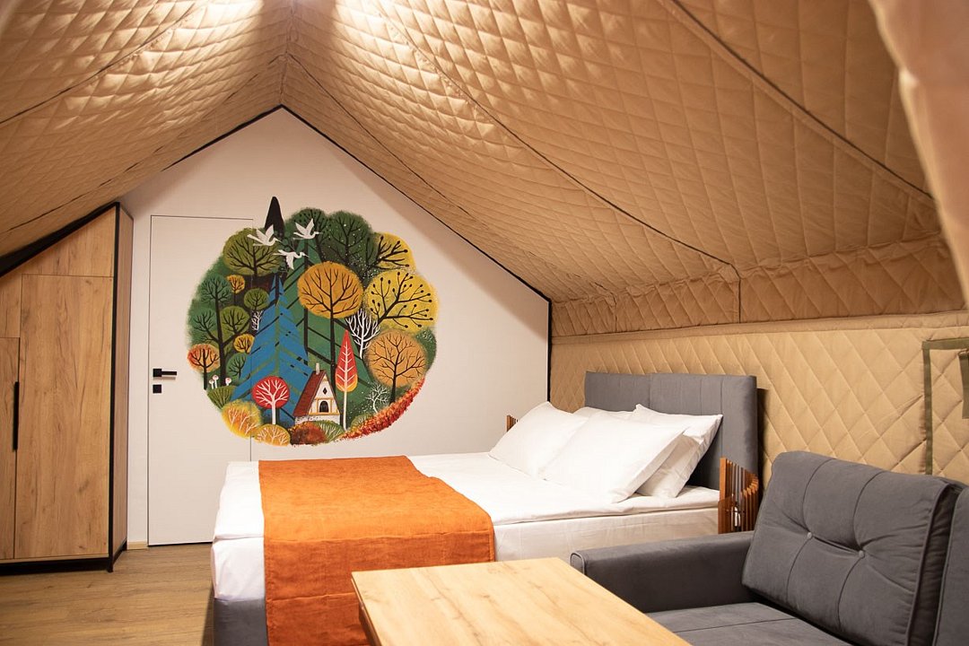 Wi-Fi, настольные лампы, фен, микроволновая печь, обогреватель, ванная комната, душевая кабина, водонагреватель, теплый пол, халаты, банные полотенца, тапочки, гигиенические средства, косметические средства, терраса, две односпальные или большая двуспальная кровать, стулья, шкаф для одежды, вешалки, журнальный столик, письменный стол, зеркало, чайный набор, информационная карта, меню, унитаз, раковина, отопление, отдельный вход в номер, ламинат, стол, тумба, туалетные средства, диван-кровать, мини-холодильник, москитная сетка, гостиничная парфюмерия, телевизор со Smart TV, теплые полы, номер для некурящих, вид на лес, чайная станция, экологичный подход, уборка номера, услуги прачечной (платно), вешалки-плечики, бутилированная вода, навес, открытый шкаф, без питомцевВ сафари-тенте