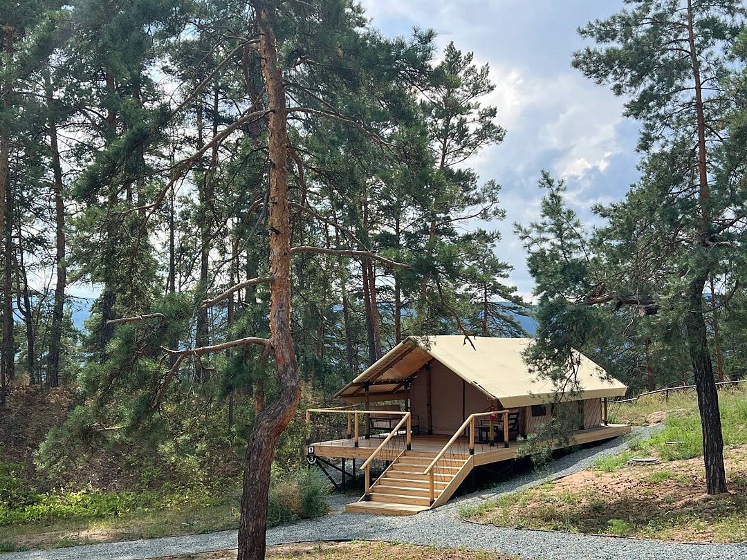 Комфортабельные сафари-тенты готовы принимать гостей круглый год - в них всегда тепло. В каждом шатре есть свой санузел, спальная зона, гостиная зона с телевизором и терраса с невероятным видом на природу. Максимальная вместимость шатра - 4 чел.Услуги и удобства