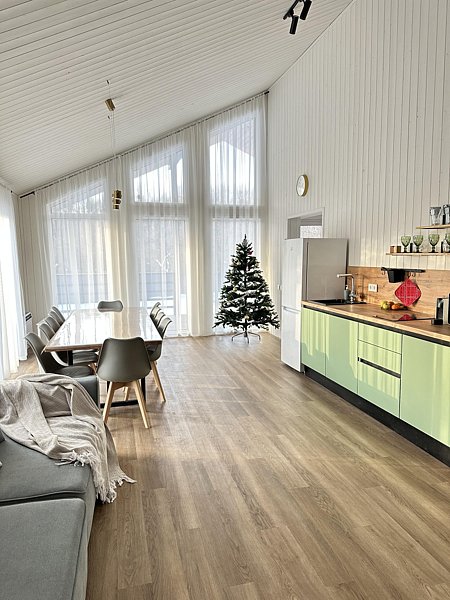 Просторная и атмосферная кухня-гостиная с большим обеденным столом и панорамным видом сделает завтраки, обеды и ужины особенными.