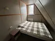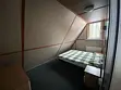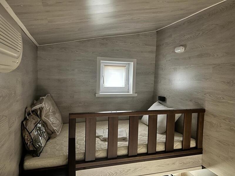 В доме одна комната, на нижнем гостевом ярусе двухместный диван, на втором ярусе двуспальная кровать и односпальная кровать.