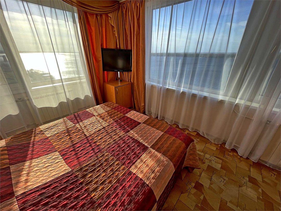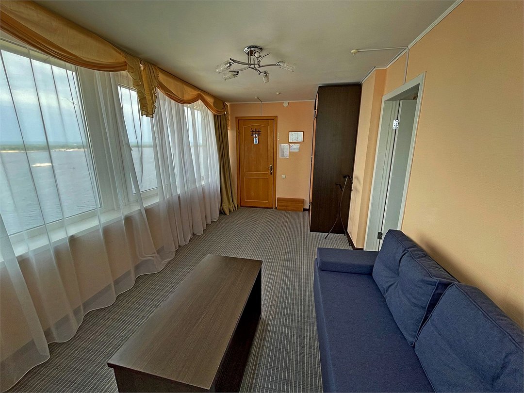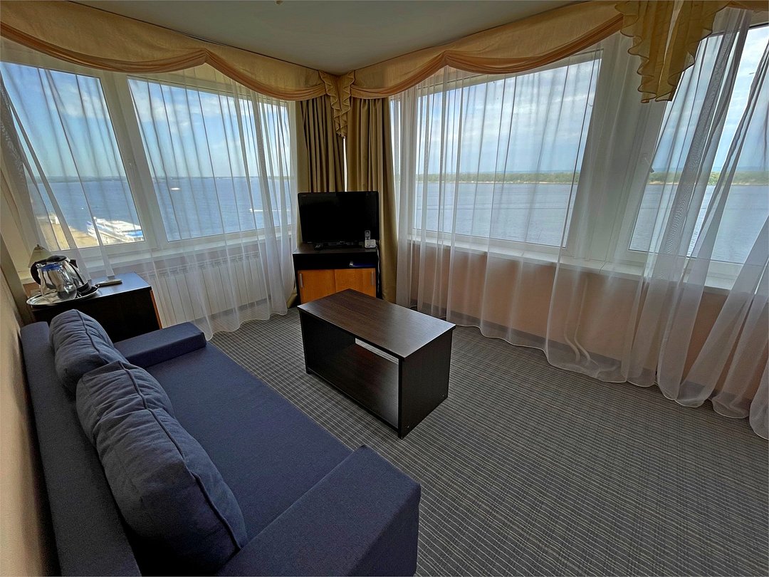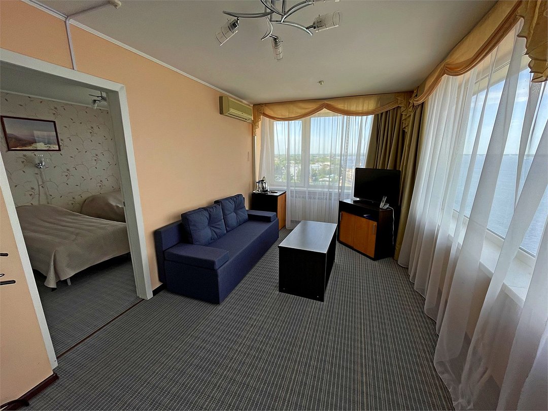 Комфортный номер, разделенный на зоны гостиной и спальни. Просторная ванная комната с ванной. Панорамный вид на ВолгуУслуги и удобства