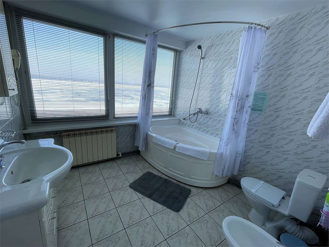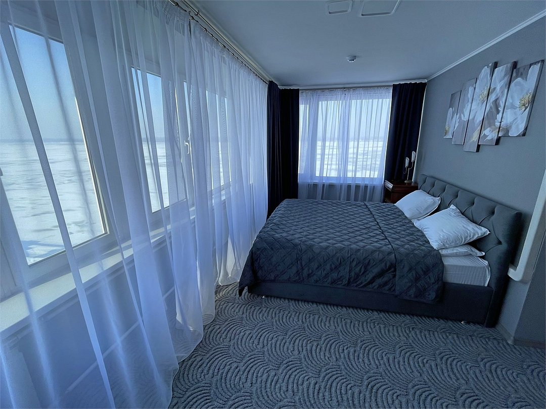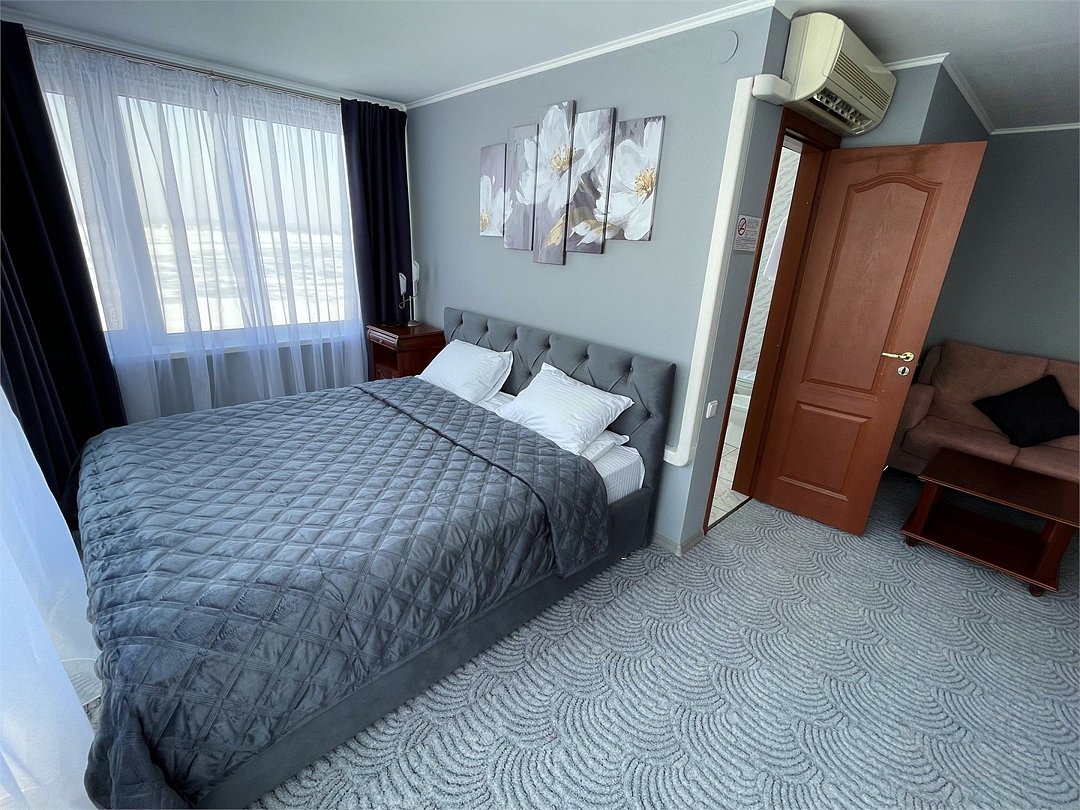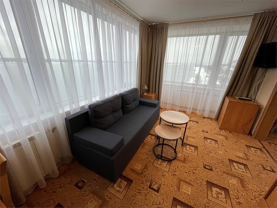 Комфортный номер, разделенный на зоны гостиной и спальни. Просторная ванная комната с ванной. Панорамный вид на ВолгуУслуги и удобства