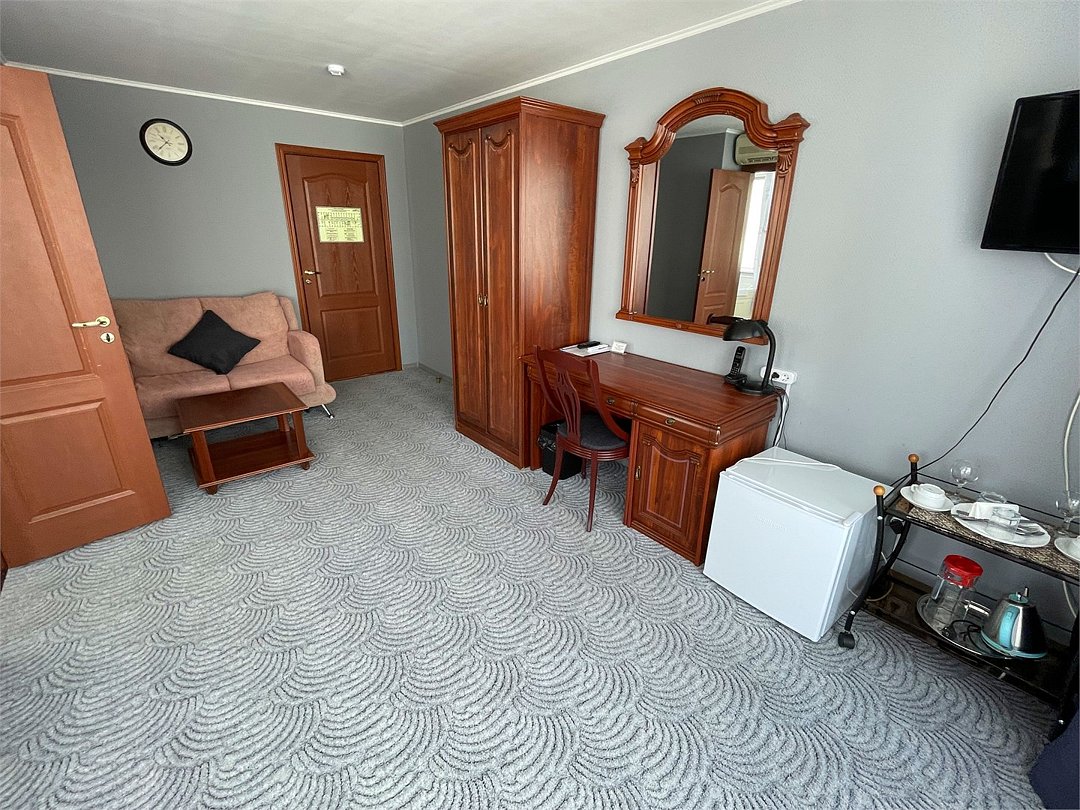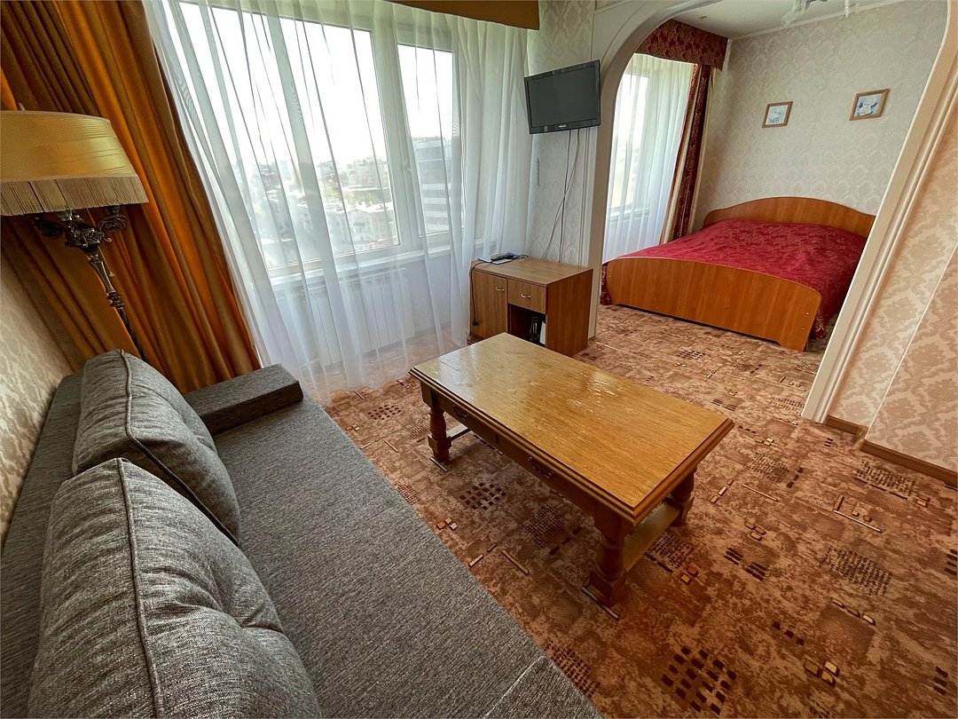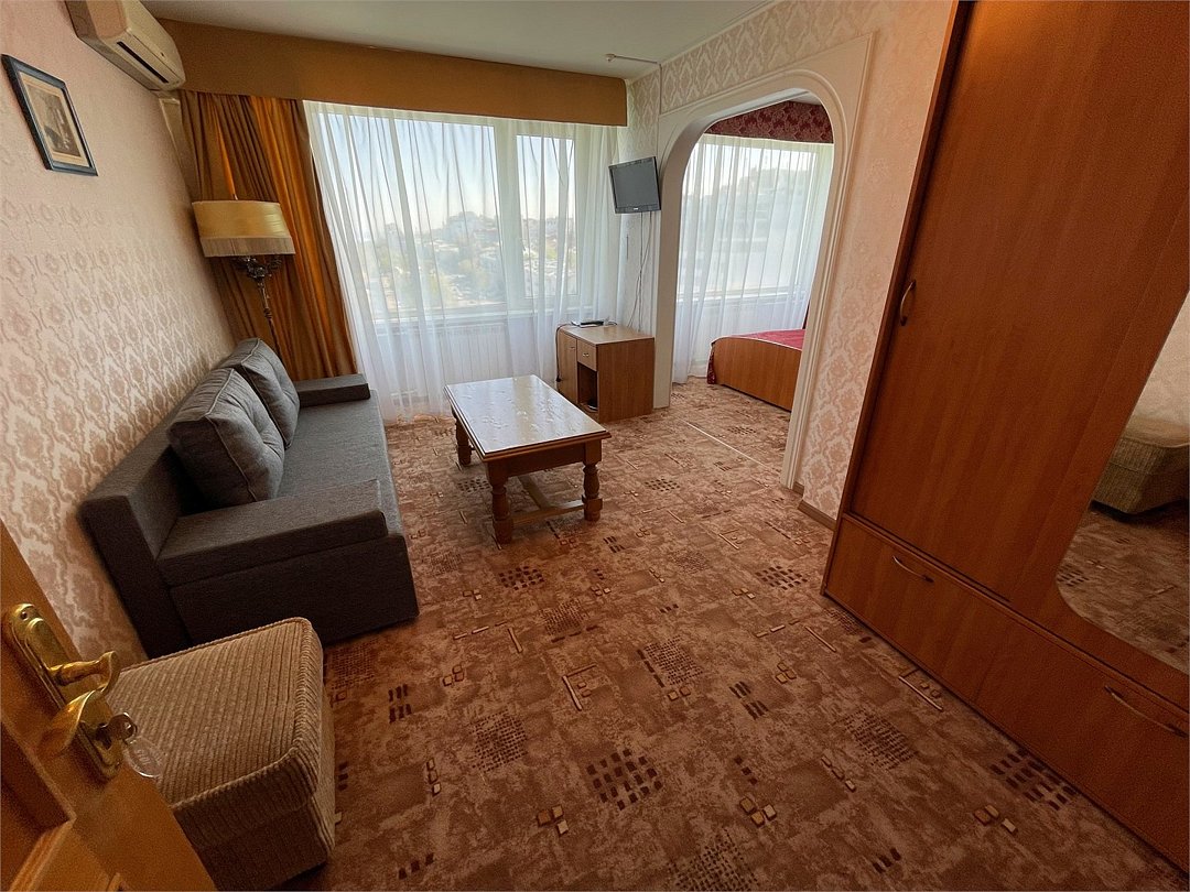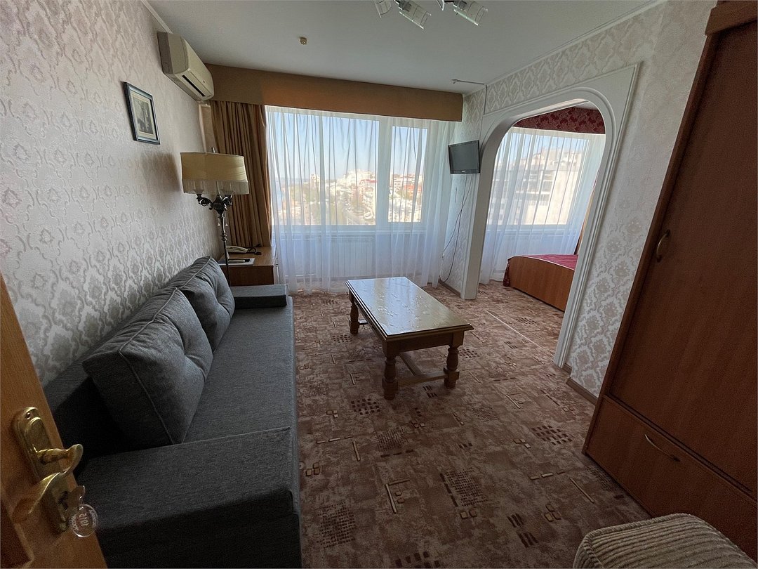 Комфортный номер, состоящий из двух комнат - гостиной и спальни. В спальне - две раздельные кровати , в гостиной - диван-кровать. Ванная комната с ванной.Услуги и удобства