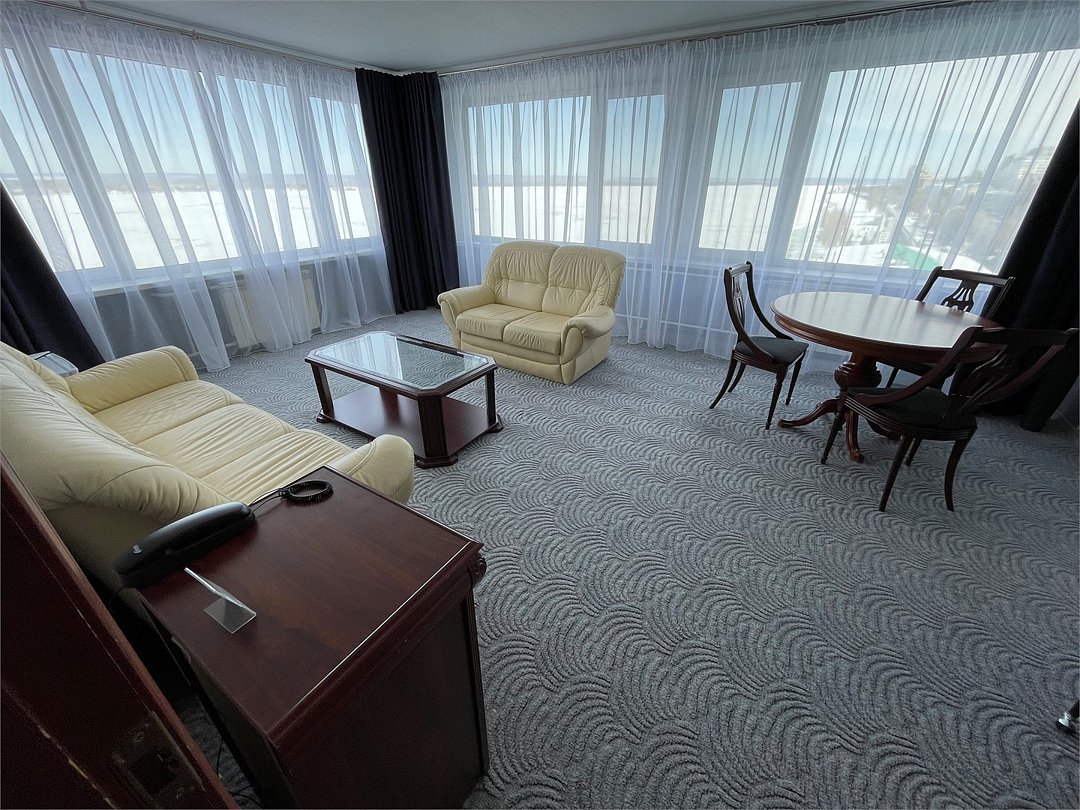 телевизор, кабельное телевидение, Wi-Fi, телефон, холодильник, кондиционер, фен, ванная комната, ванна, санузел, халаты, банные полотенца, тапочки, гигиенические средства, двуспальная кровать, диван, тумбы, стулья, шкаф для одежды, вешалки, журнальный столик, письменный стол, зеркало, пуфики, две комнаты, набор посуды, информационная карта, меню, сейф, чайник, унитаз, раковина, гостиная зона, ковровое покрытие, отопление, вид на город, кулер на этаже, вид на реку, кресло, без питомцевВ гостиничном номере