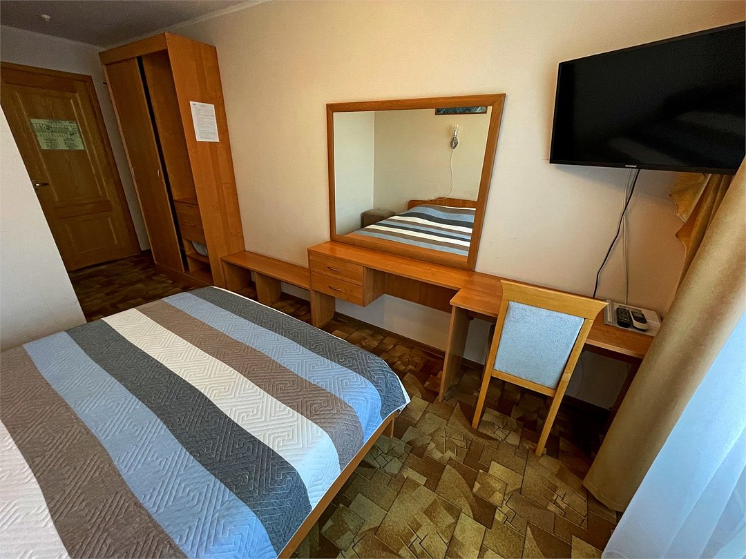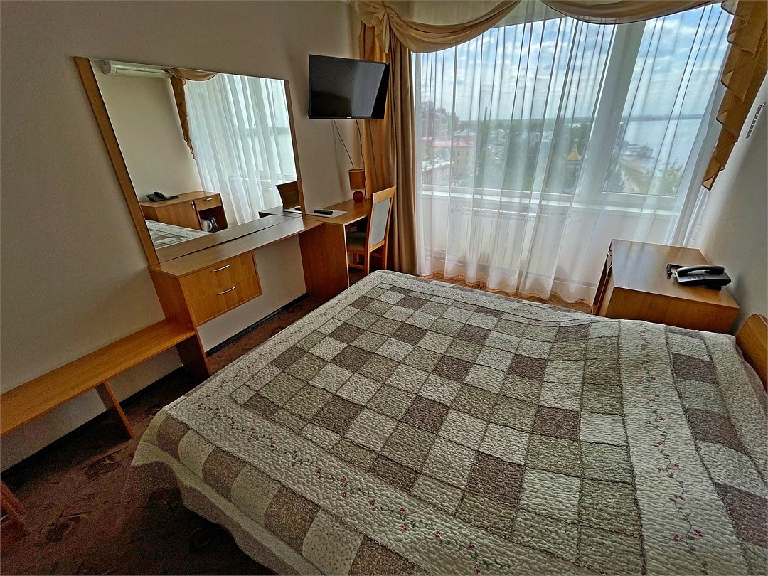 телевизор, кабельное телевидение, Wi-Fi, телефон, холодильник, светильник, фен, вентилятор, санузел, банные полотенца, пляжные полотенца, полутораспальная кровать, шкаф для одежды, вешалки, зеркало, набор посуды, сейф, чайник, унитаз, раковина, ковровое покрытие, отопление, душ, вид на город, кулер на этаже, вид на реку, стаканы, стул, стол, тумба, туалетные средства, москитная сетка, шкаф-купе, шапочка для душа, мыло, без питомцевВ гостиничном номере