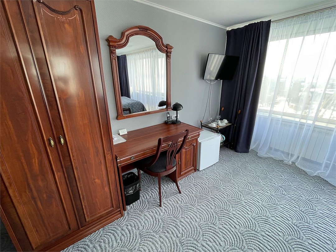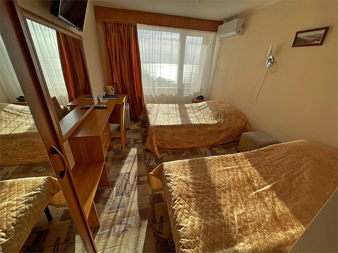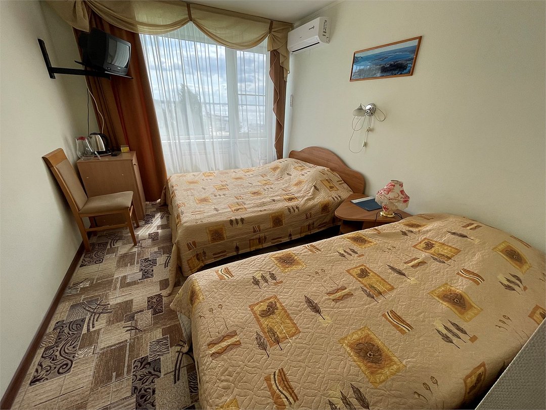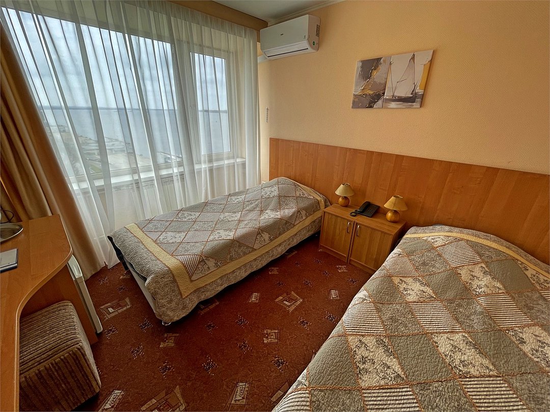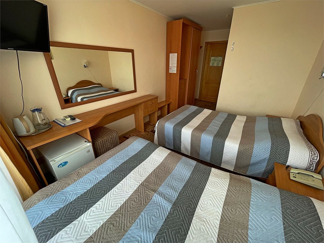 телевизор, кабельное телевидение, Wi-Fi, телефон, холодильник, светильник, фен, ванная комната, санузел, халаты, банные полотенца, пляжные полотенца, гигиенические средства, две односпальные кровати, вешалки, багажная тумба, зеркало, пуфики, набор посуды, сейф, чайник, унитаз, раковина, ковровое покрытие, отопление, душ, вид на город, кулер на этаже, вид на реку, стаканы, стол, тумба, сплит-система, шкаф-купе, пуфик, без питомцевВ гостиничном номере