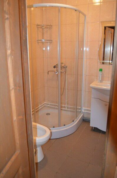 Санузел: душевая кабина, раковина + зеркало, унитаз