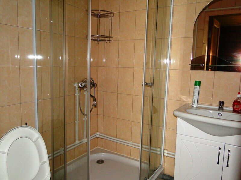 Санузел: душевая кабина, раковина + зеркало, унитаз.