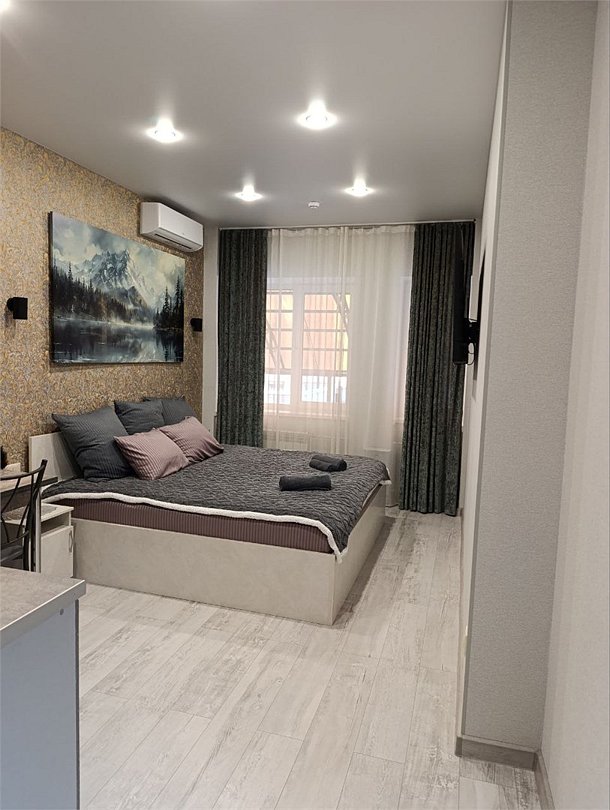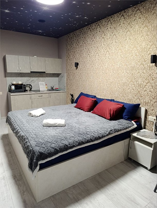 Апартаменты "Люкс" с кроватью "King Size", кухней и ванной. Номер оснащен: кондиционер, Smart TV", холодильник двухкамерный, варочная панель, посуда, чайник, фен, халаты, косметические средства. Окунись в мир комфорта и роскоши.Услуги и удобства
