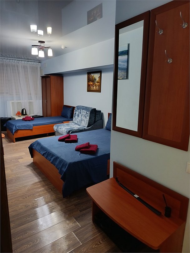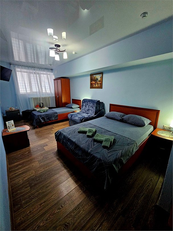 Улучшенный комфортный семейный номер, с двуспальной кроватью и односпальной кроватью и всеми удобствами. Номер оснащен: кресло - диван, Wi- Fi, TV, мини- холодильник, кондиционер, шкаф, отопление, чайник, чайная пара, стаканы, чай, сахар, санузел, душевая, гигиенические гигиенические принадлежности.Услуги и удобства