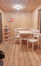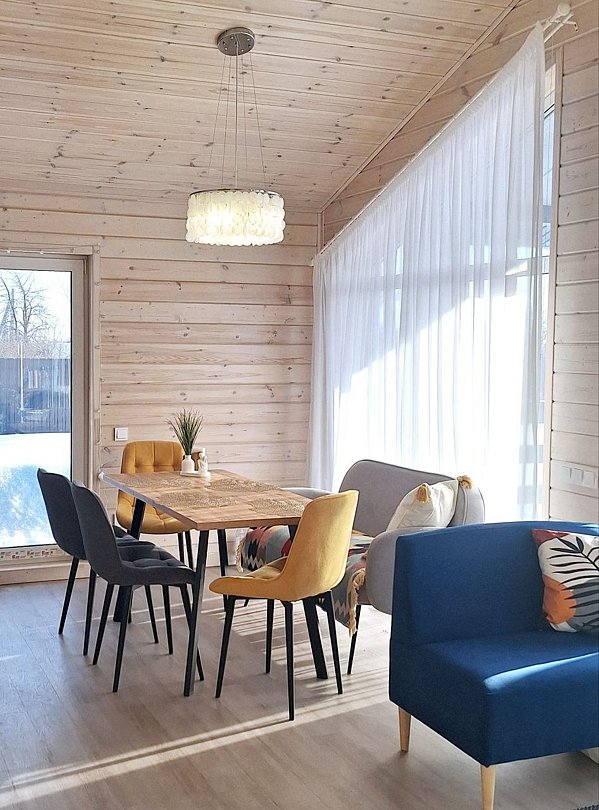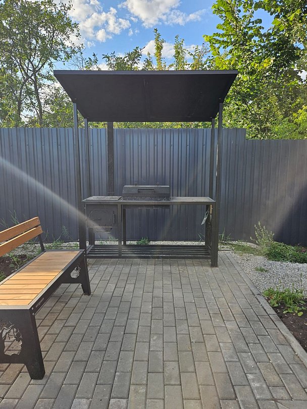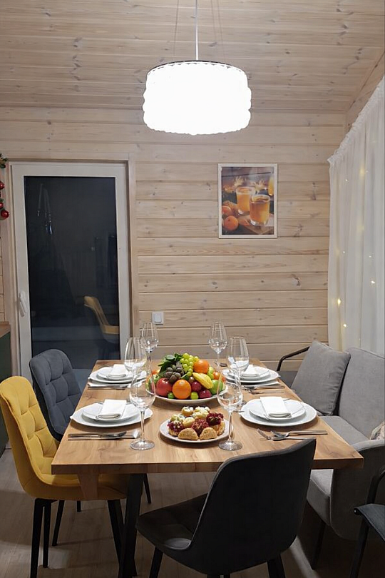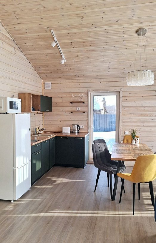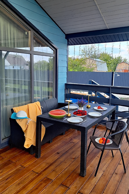 Дом с двумя спальнями и гостиной с верандой. Предназначен для размещения от четырех до шести гостей. На территории дома находится мангальная зона, бассейн и батут (работают в летнее время).