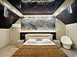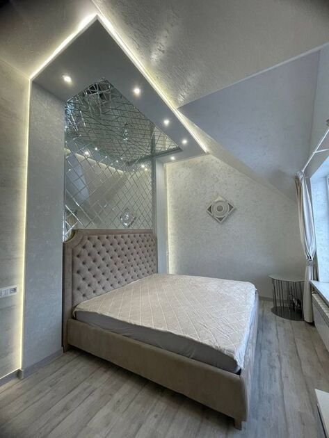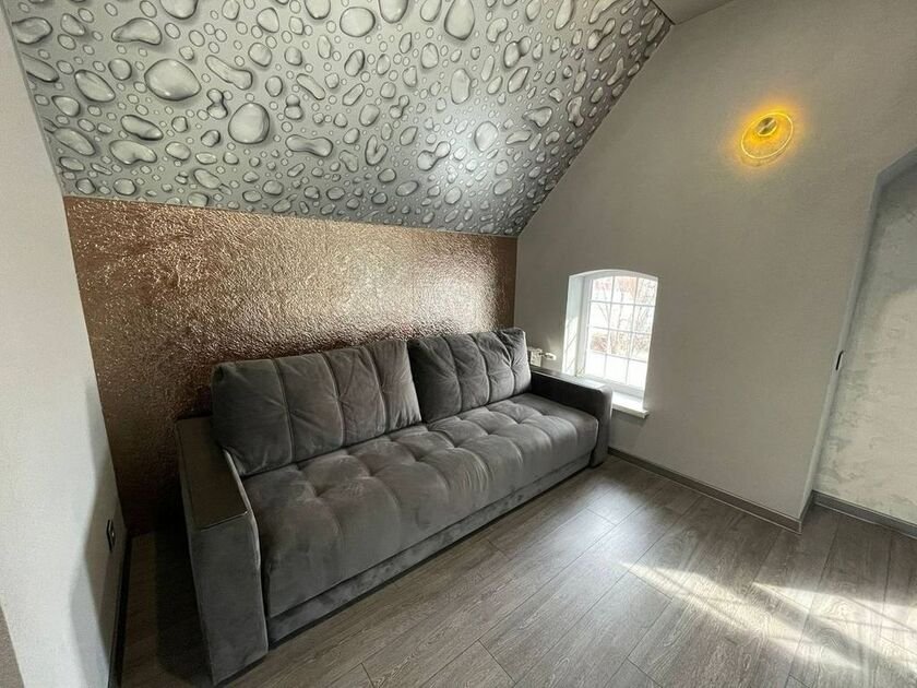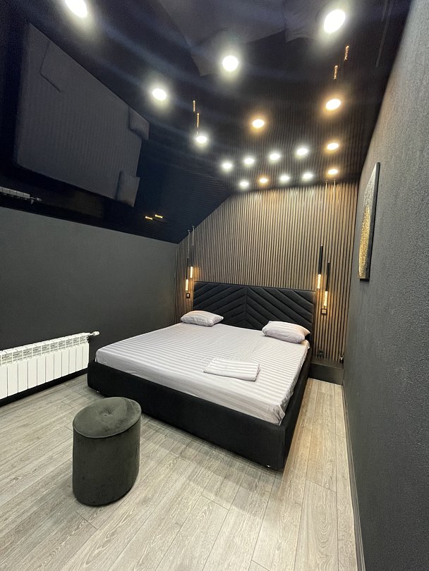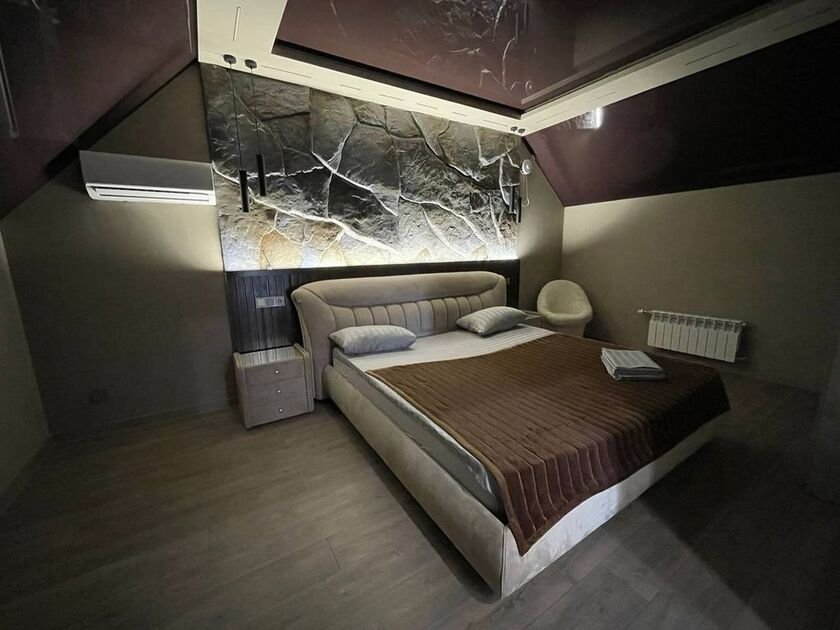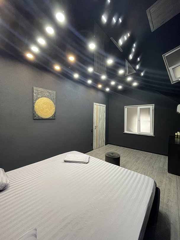 На первом этаже расположены просторная гостиная, современная кухня, бассейн и сауна. Также есть санузел и особенный душ, который больше нигде не встретите! Второй этаж — проходная зона с диваном, совмещённый санузел и две роскошные спальни.