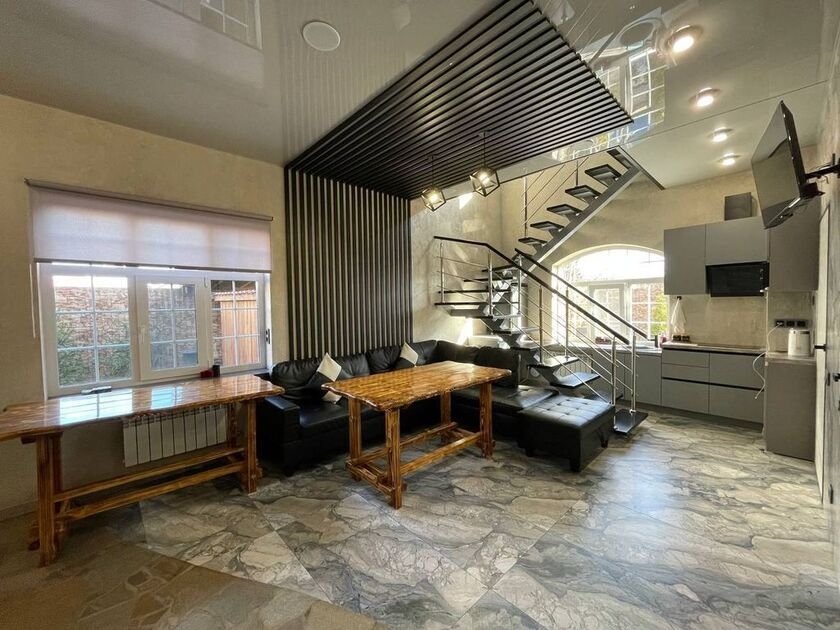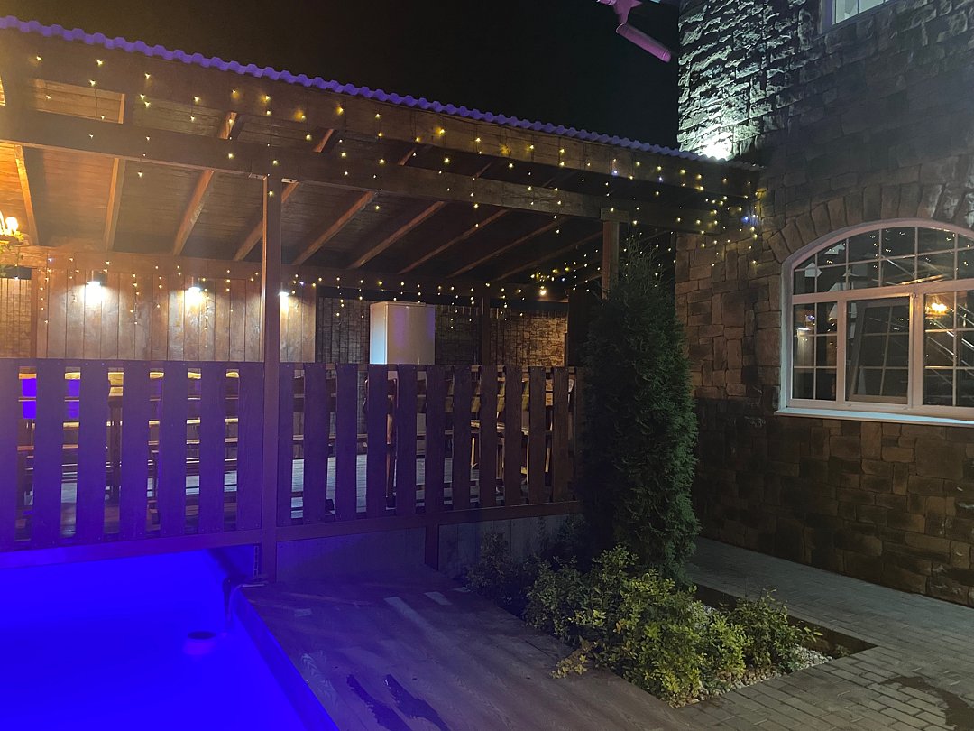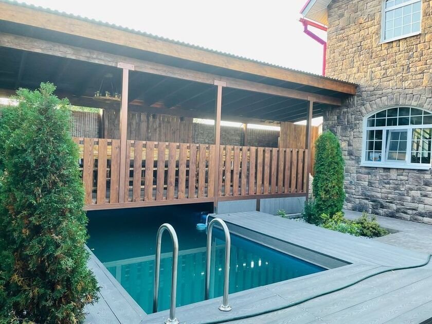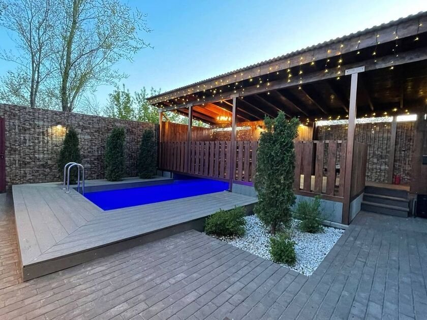 Дом полностью оборудован, находится на закрытой территории. Есть шесть парковочных мест, просторная беседка на двадцать человек и уютная мангальная зона. На улице расположен бассейн с подсветкой.