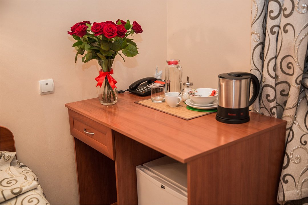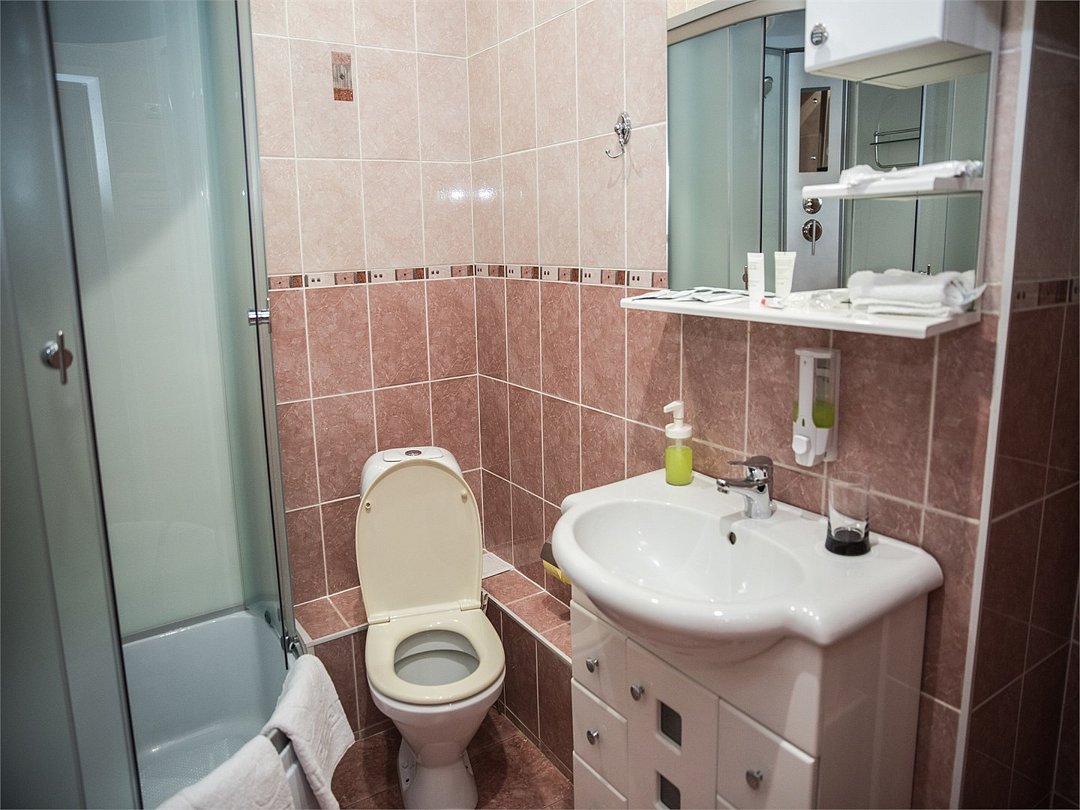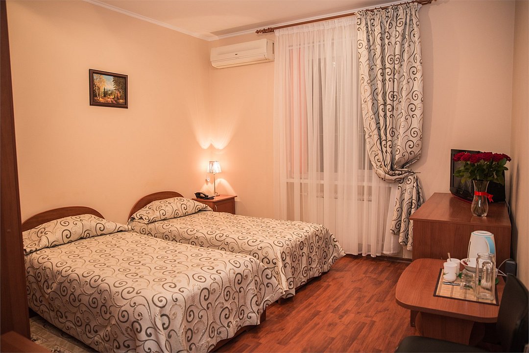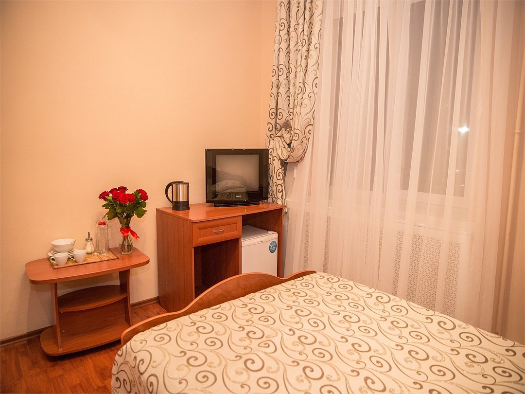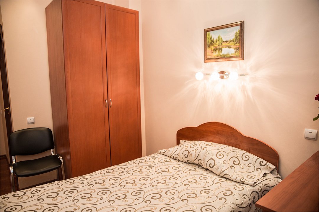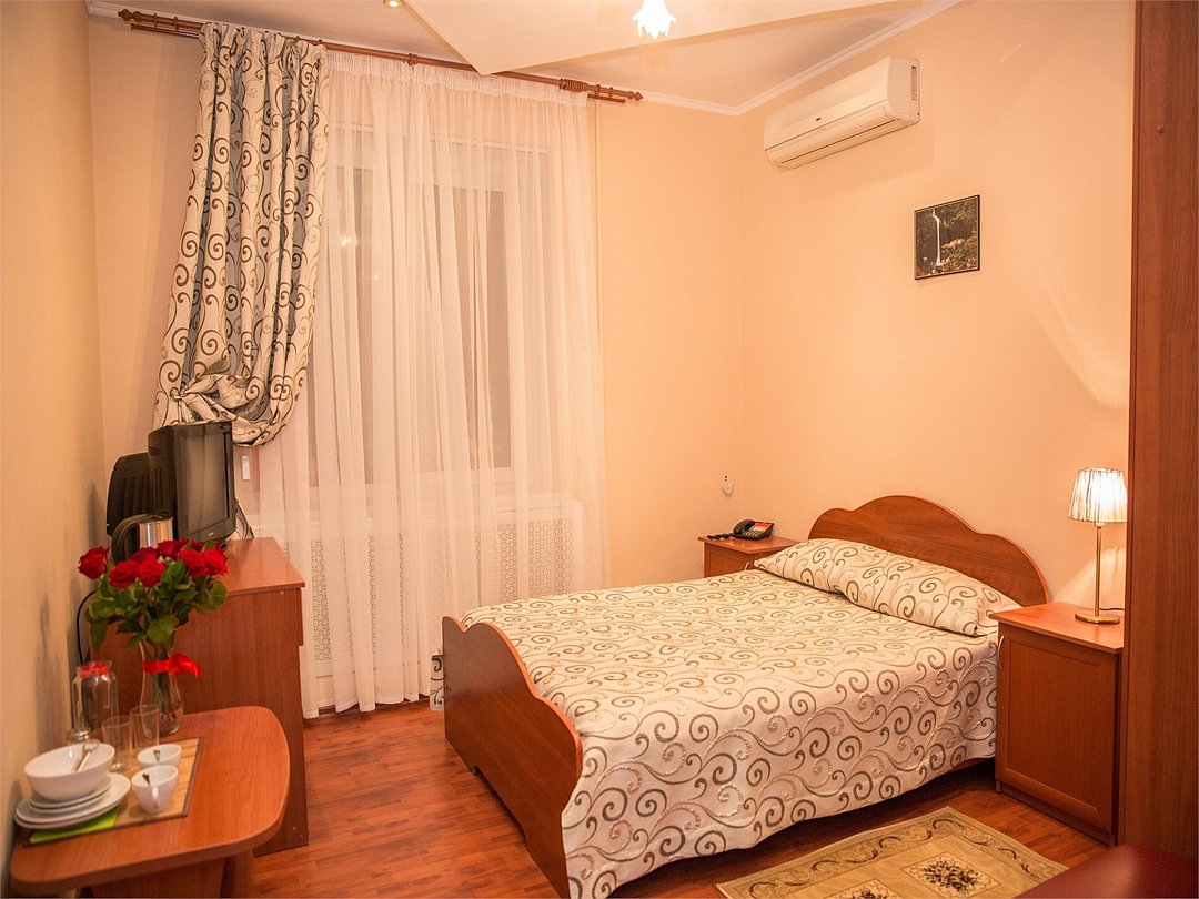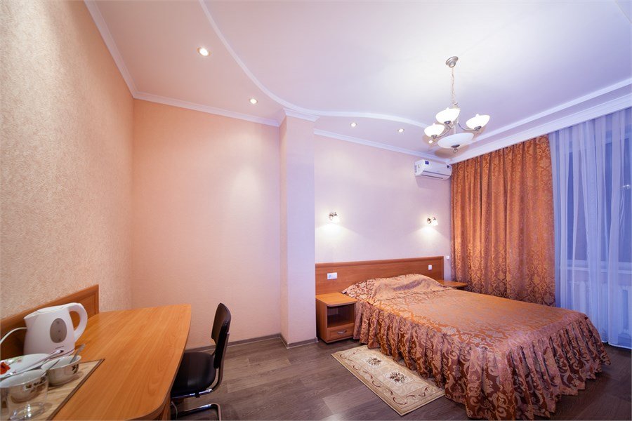 Номер с двуспальной кроватью и вместительным шкафом позволит без труда разместиться семейной паре или одинокому путешественнику, ценящему комфорт. Современная душевая кабина поможет расслабиться после насыщенного дня. Большое количество тумбочек и шкафчиков способно вместить невероятное количество мелких вещей и всевозможных косметических средств. Разноуровневый потолок, мягкие цвета внутренней отделки, несколько вариантов освещения комнаты – все это предназначено для того, чтобы сделать Ваше проживание в нашем отеле максимально приятным.Услуги и удобства