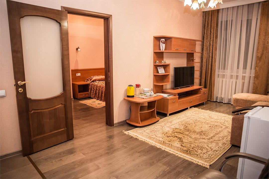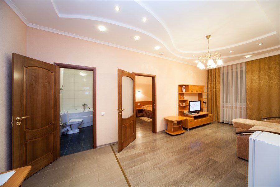 Двухкомнатный номер с удобным диваном и роскошной двуспальной кроватью. Наличие двух комнат позволяет нашим гостям заниматься различными делами, совершенно не мешая друг другу. Рабочий стол расположен в спальной комнате, которая может на время стать кабинетом, позволяя другим гостям отдыхать в соседней комнате с телевизором. В ванной комнате установлена качественная сантехника. Изюминкой номера является большая современная ванна.Услуги и удобства