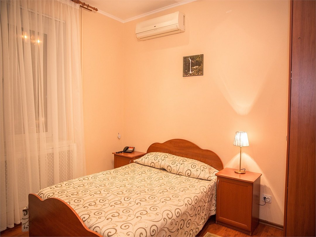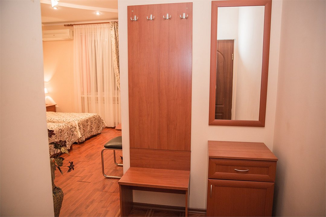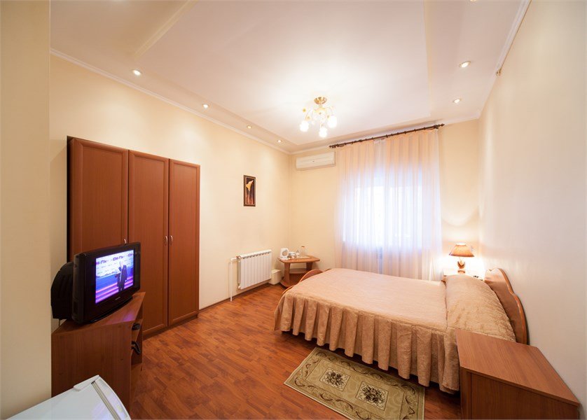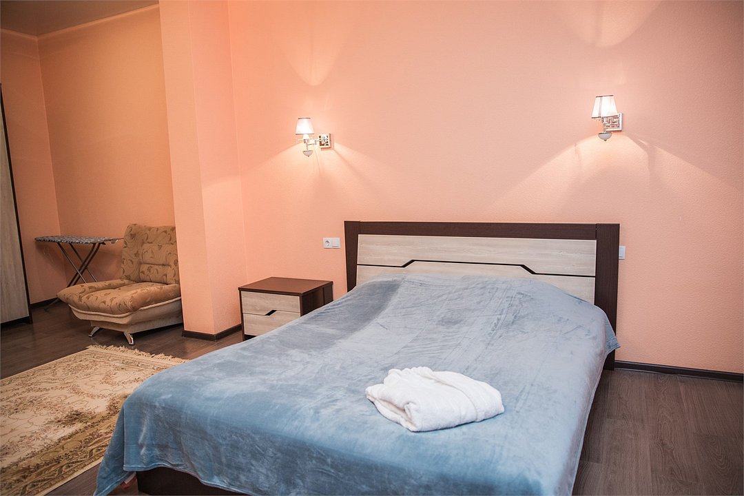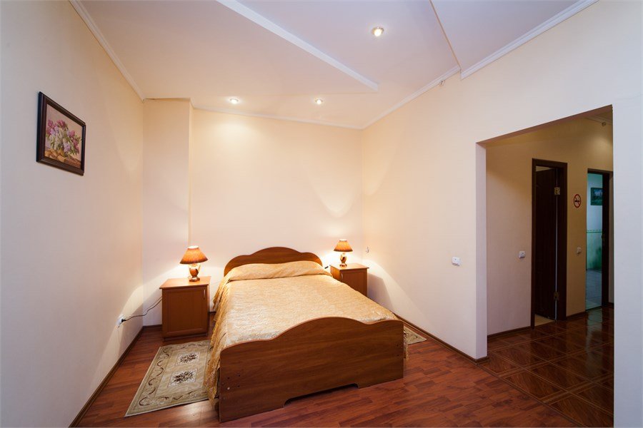 Просторный и уютный номер для двоих. Мягкие цвета интерьера, удобная двуспальная кровать, разноуровневый потолок, несколько вариантов освещения – от яркого до приглушенного – все это способно сделать отдых в нашем отеле максимально приятным. В номере предусмотрено большое количество мест для хранения одежды и всевозможных полезных мелочей. В ванной комнате установлена качественная современная сантехника.Услуги и удобства