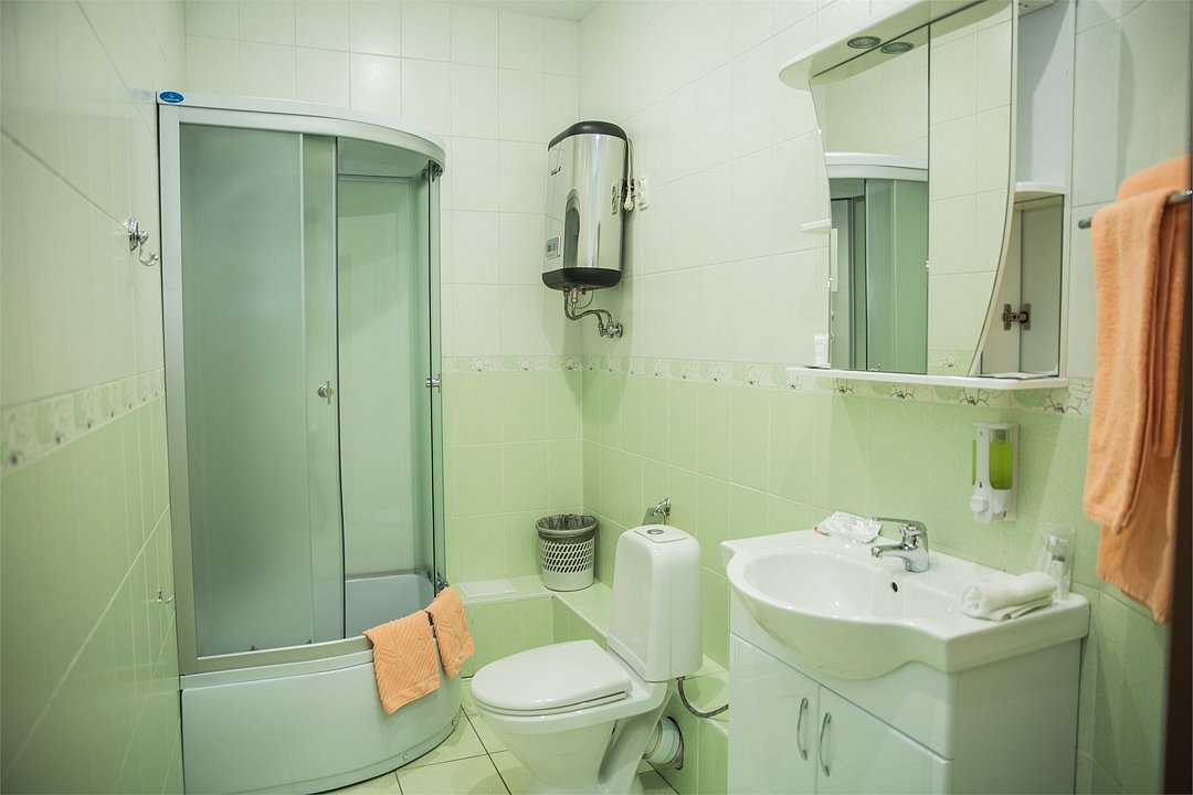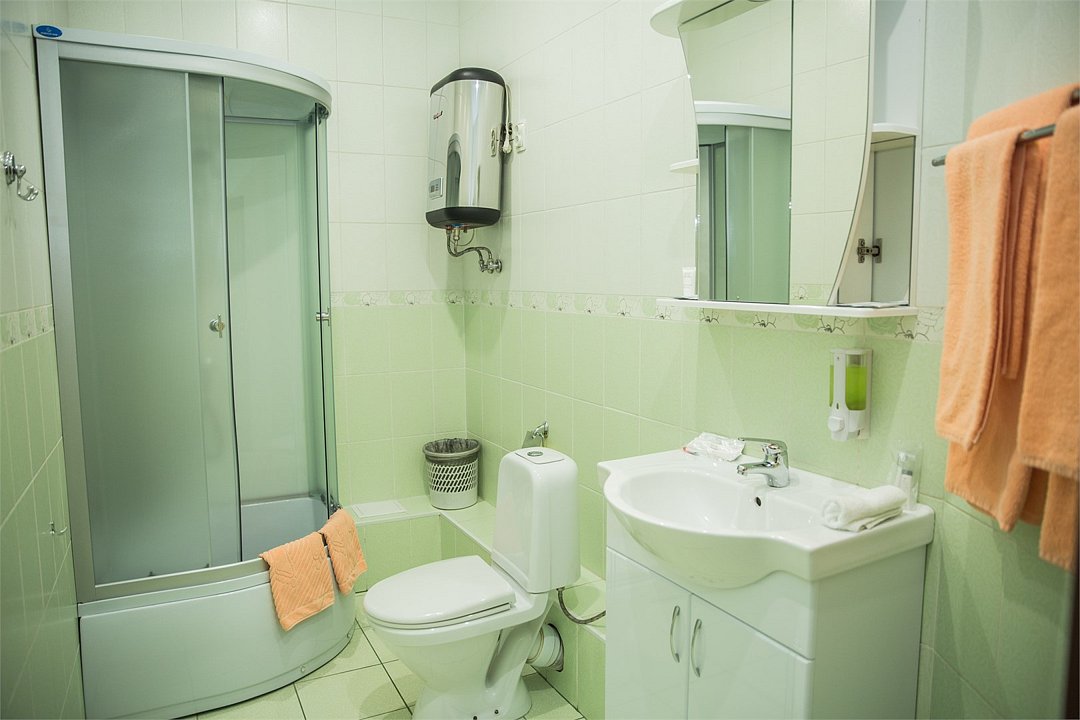 Номер способен разместить от 2 до 4 гостей. Имеется необходимая мебель. В комнате есть телевизор, душевая кабина, кондиционер, холодильник, микроволновая печь, чайник, телефон. Кухня оборудована современной техникой и посудой, которая понадобится вам для приготовления. Наша задача — сделать ваше пребывание в отеле максимально комфортным и приятным.Услуги и удобства