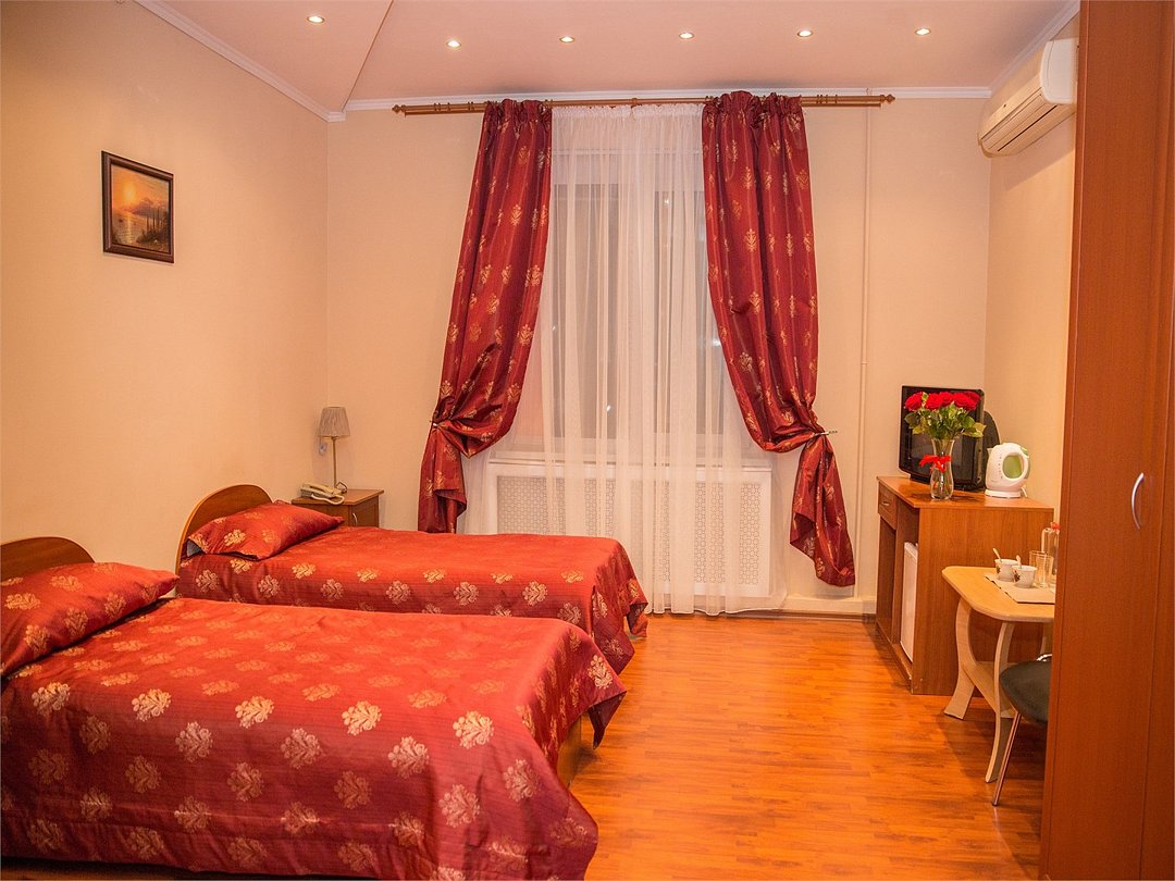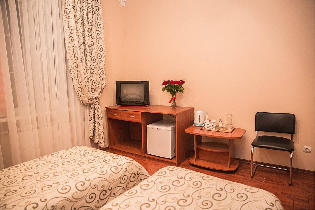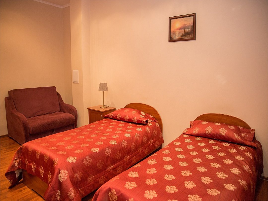 кабельное телевидение, Wi-Fi, кондиционер, светильник, душевая кабина, санузел, банные полотенца, две односпальные кровати, диван, тумбы, стулья, шкаф для одежды, вешалки, журнальный столик, багажная тумба, зеркало, набор посуды, чайник, унитаз, раковина, отопление, вид на город, кулер на этаже, вид во двор, высокие потолки, стаканы, стул, стол, тумба, мини-холодильник, без питомцевВ номере