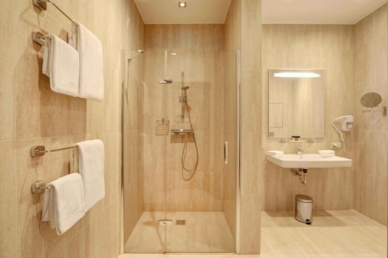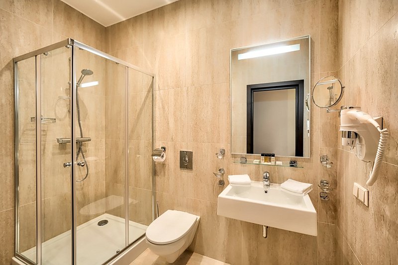 Номера большие, с высокими потолками. Удобная кровать, в ванной комнате есть все, что нужно.