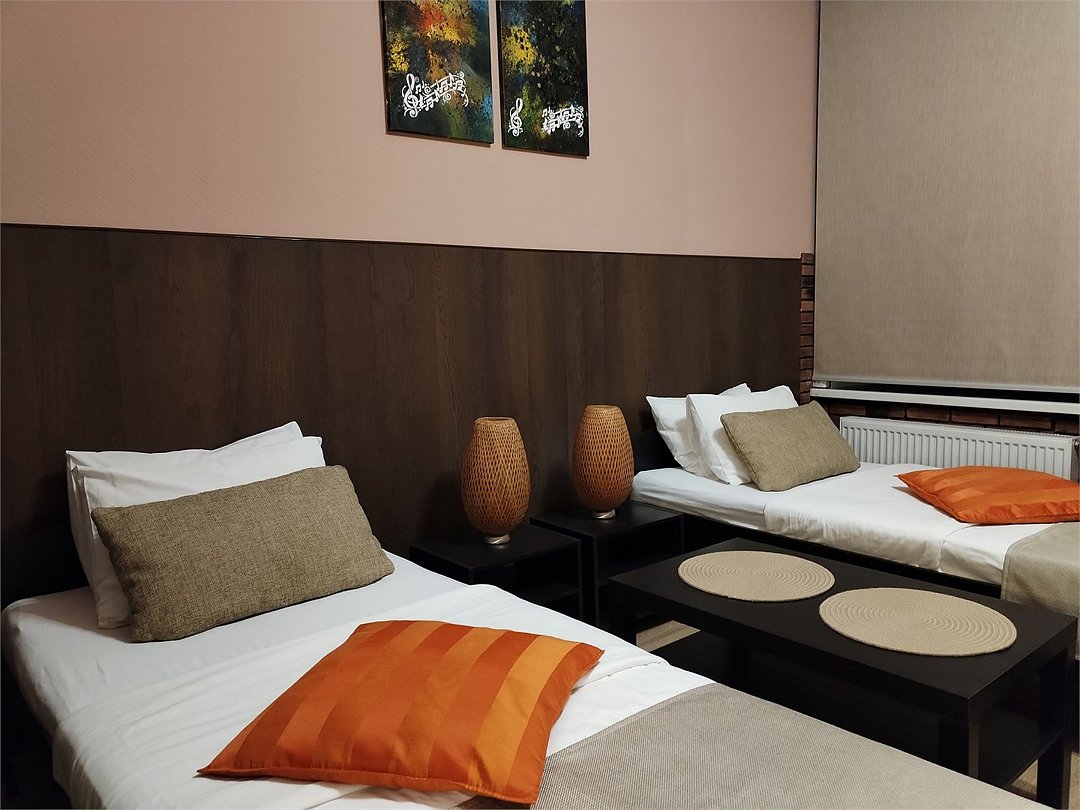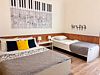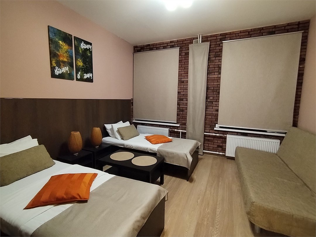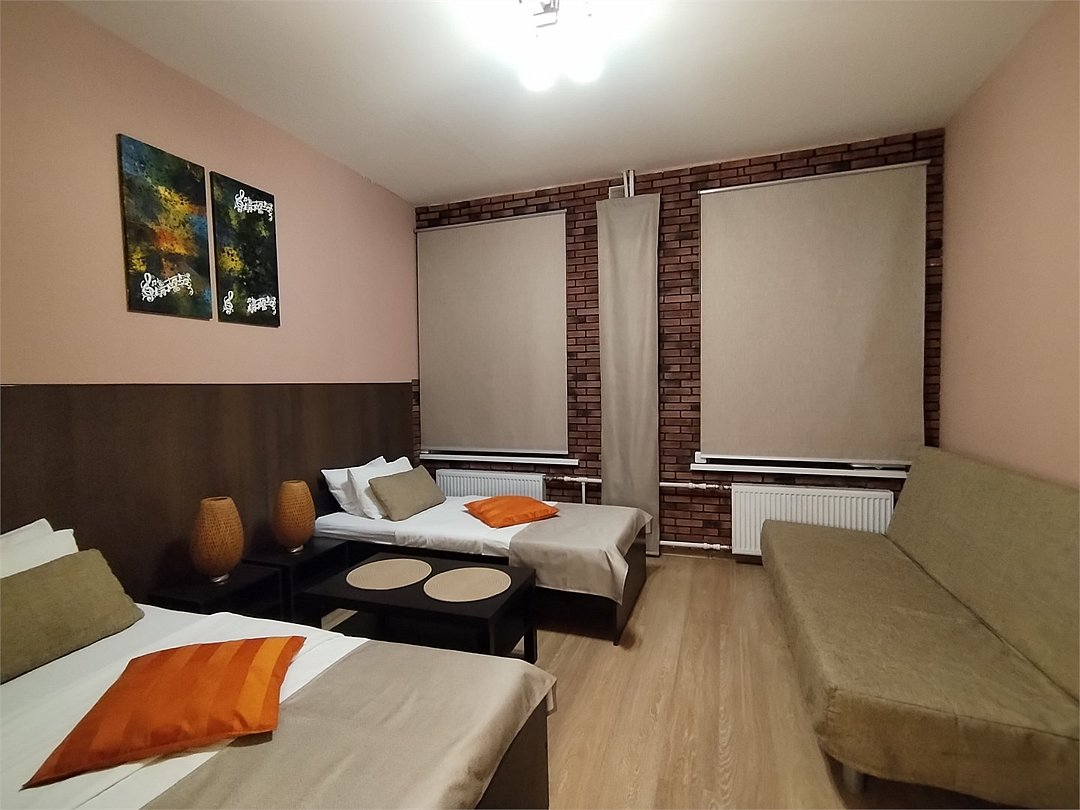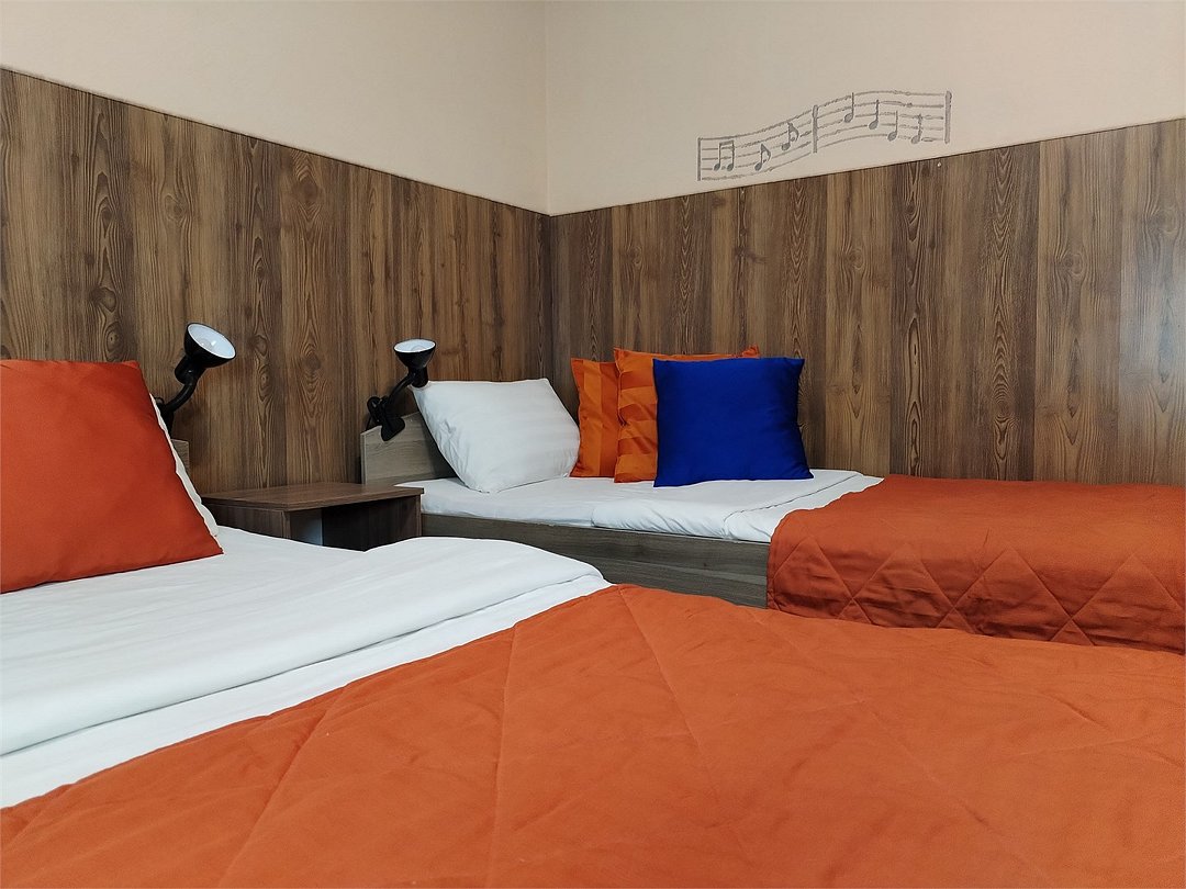 Просторная комната, оформленная в теплых тонах. Размещение от 1 до 3 человек. Возможно еще один ребенок без предоставления отдельного места. Имеется собственная ванная комната и мини-кухня. Гости могут пользоваться стиральной машиной, гладильным принадлежностями, аптечкой, которые находятся в общей зоне.Услуги и удобства
