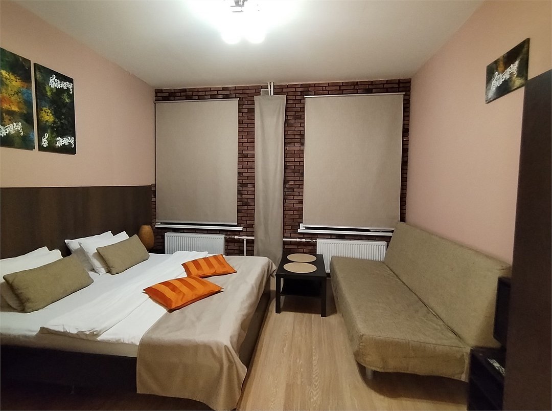 Wi-Fi, холодильник, кондиционер, настольные лампы, фен, вентилятор, плита для приготовления пищи, микроволновая печь, утюг, ванная комната, душевая кабина, банные полотенца, тапочки, косметические средства, две односпальные или большая двуспальная кровать, кресла, шкаф для одежды, вешалки, журнальный столик, зеркало, раковина, вид на город, стул, тумба, туалетные средства, туалет, диван-кровать, раскладной диван, телевизор с плоским экраном, духовка, можно с питомцамиВ номере