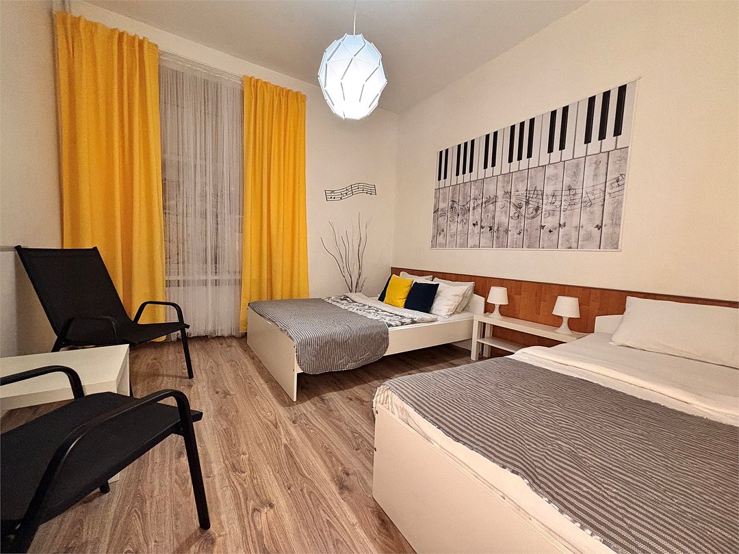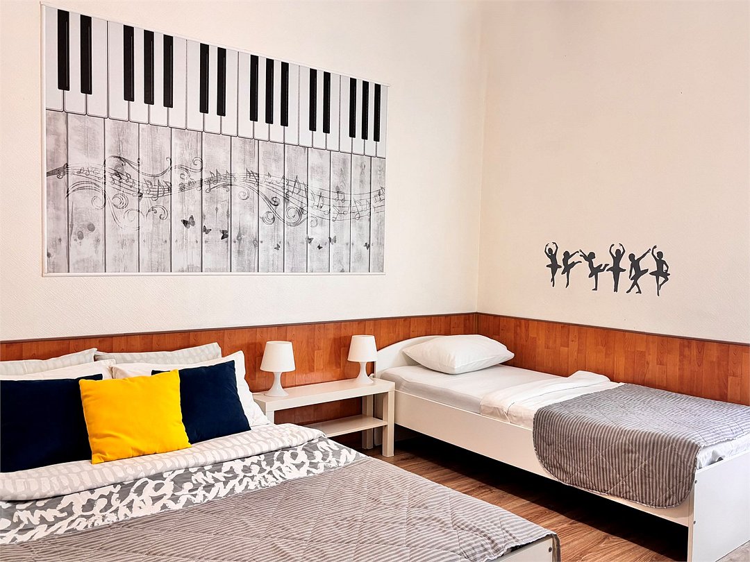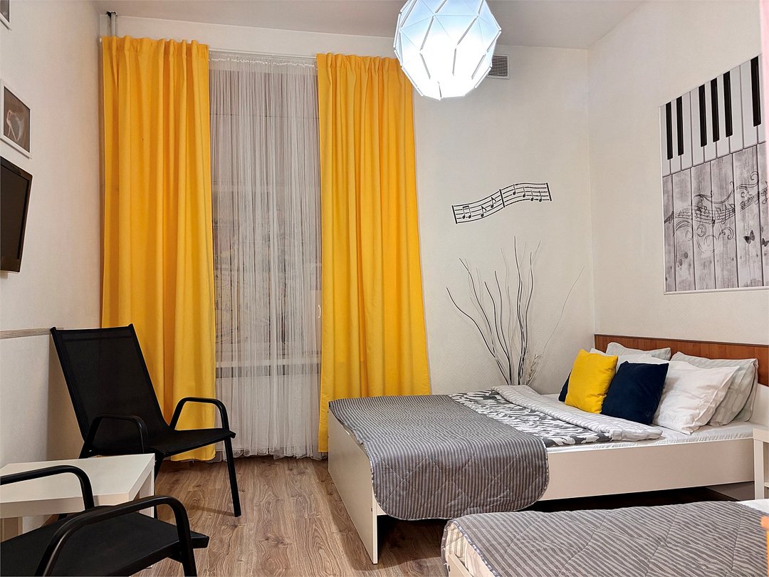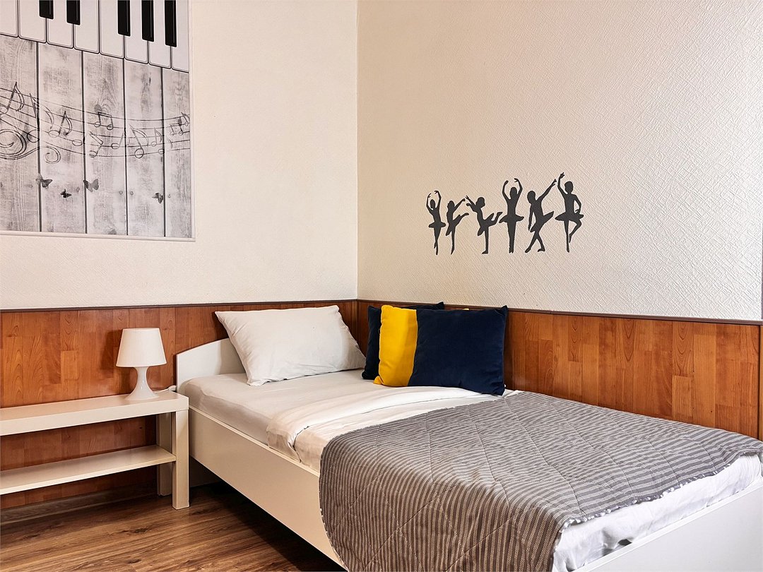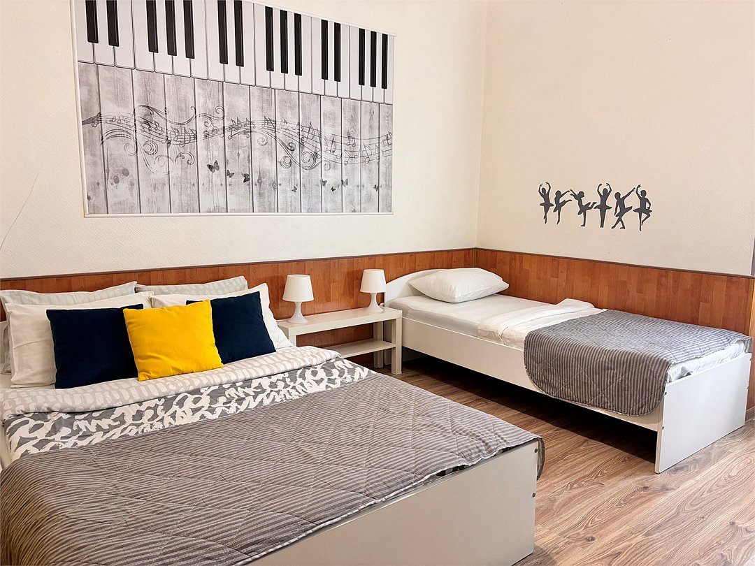 Просторная меблированная комната, размещением от 1 до 3 человек, оформленная в музыкальном стиле. Располагает собственной ванной комнатой и мини-кухней. Гости также могут пользоваться стиральной машиной, гладильными принадлежностями, аптечкой, которые находятся в общей зоне.Услуги и удобства