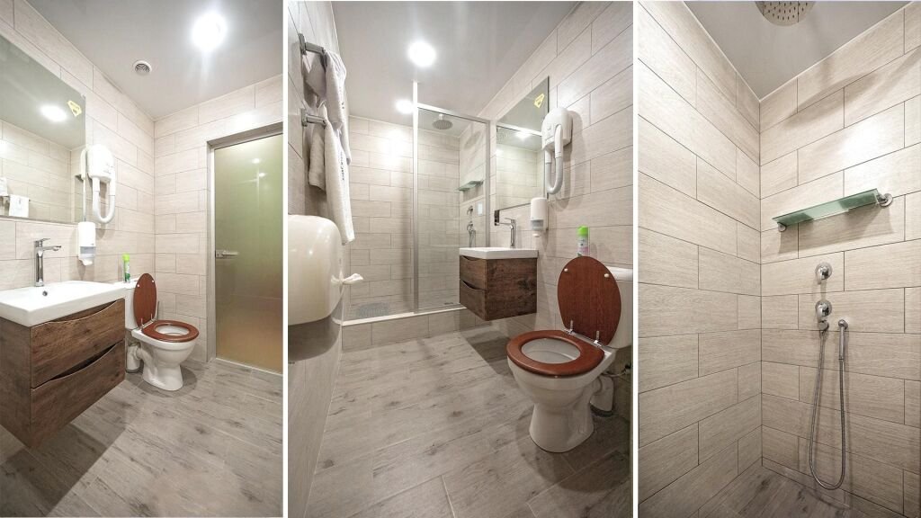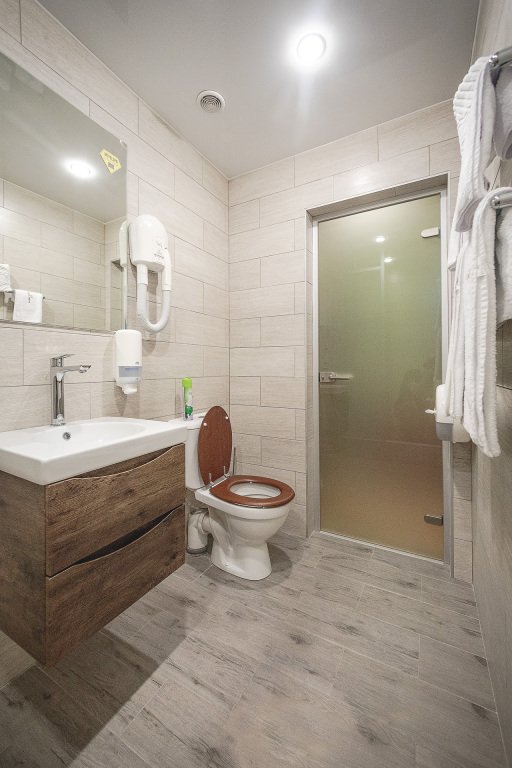 спутниковыми каналами, телефоном. В ванной комнате с душем предоставляются бесплатные туалетно-косметические принадлежности и фен. Кроме того, в номере имеются халаты и тапочки.