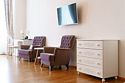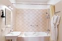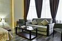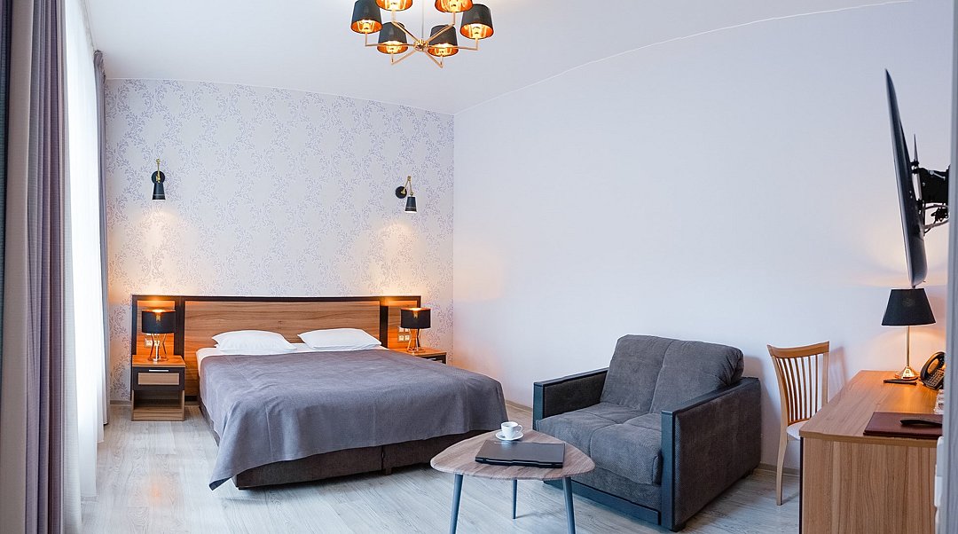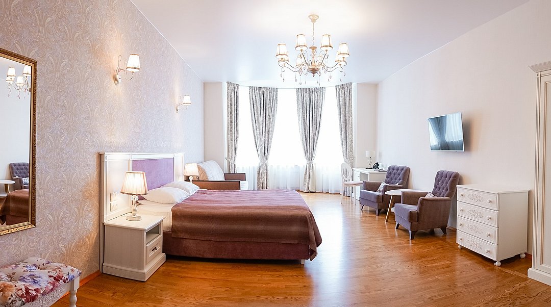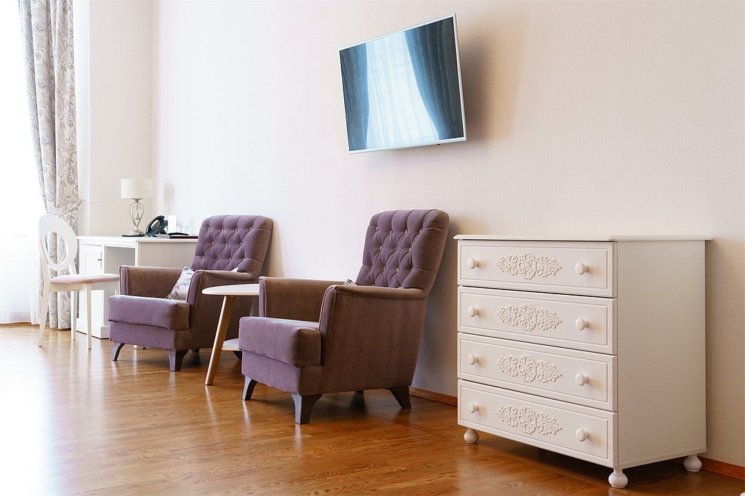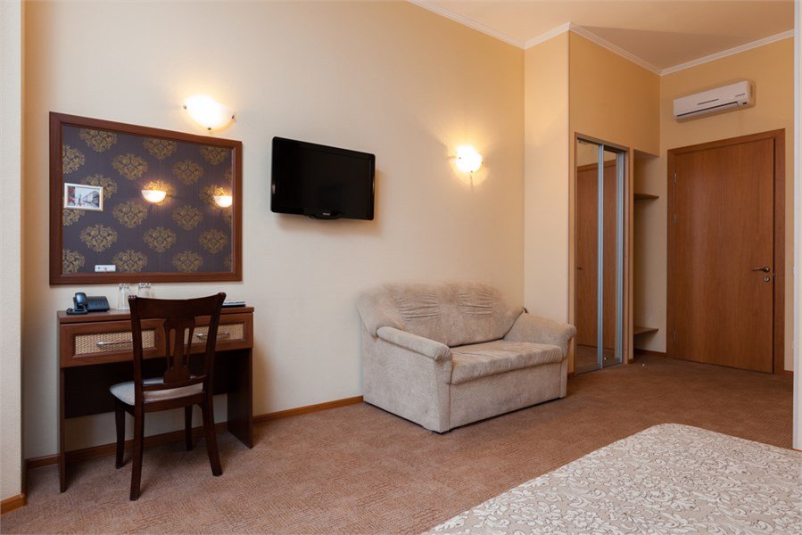 телевизор, Wi-Fi, телефон, холодильник, кондиционер, фен, ванна, ванная с джакузи, банные принадлежности, халаты, банные полотенца, тапочки, косметические средства, кровать «King size», две односпальные кровати, диван, стулья, шкаф для одежды, вешалки, журнальный столик, письменный стол, багажная тумба, зеркало, мягкая мебель, кулер на этаже, креслоВ номере