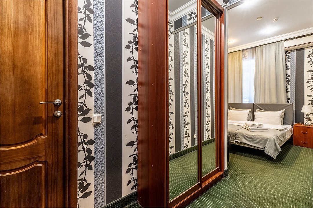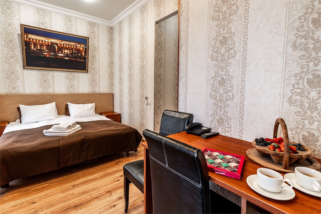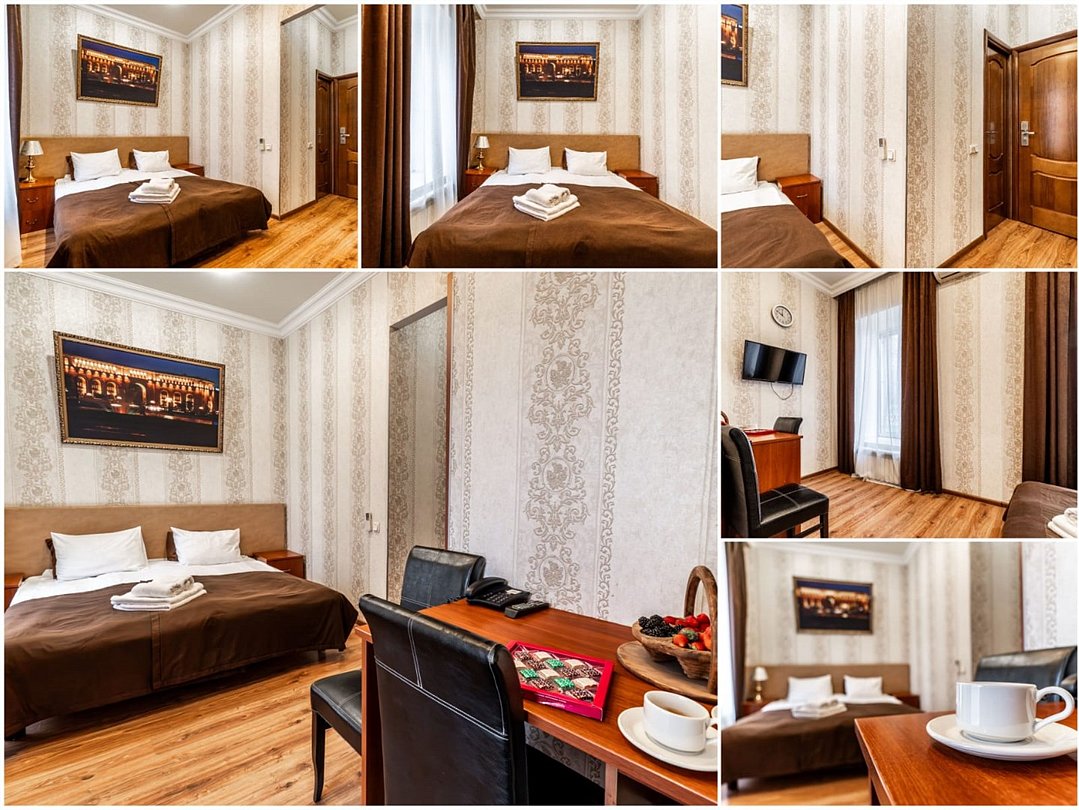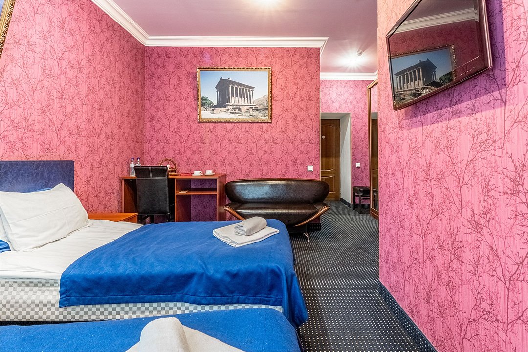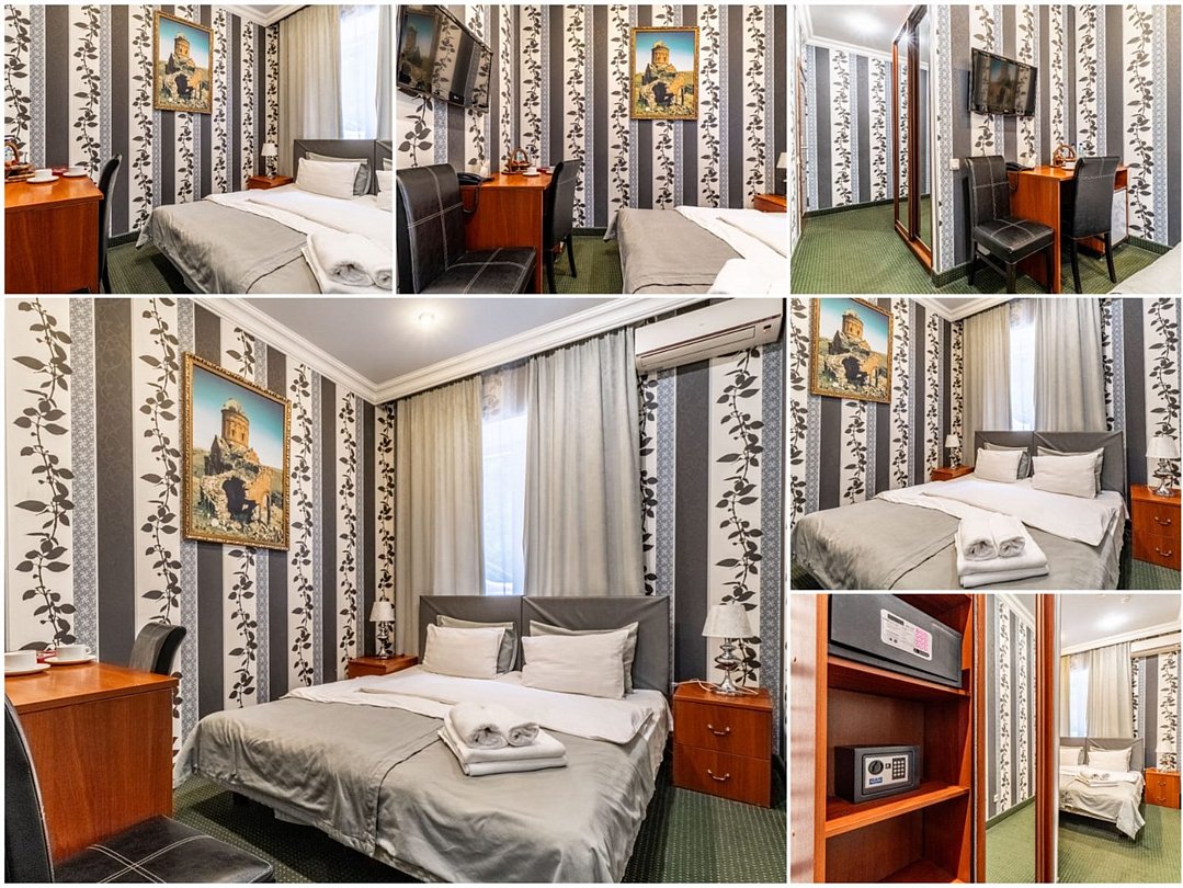 Однокомнатный номер для двоих со всеми необходимыми удобствами. Широкая двуспальная кровать, либо 2 раздельные кровати, шкаф, стол, стул, кондиционер, плазменный большой телевизор, туалетная комната со своим душем и туалетом. В номере так же есть холодильник, небольшой набор посуды, фен, сейф. Банные полотенца и косметические средства, ложка для обуви.Услуги и удобства
