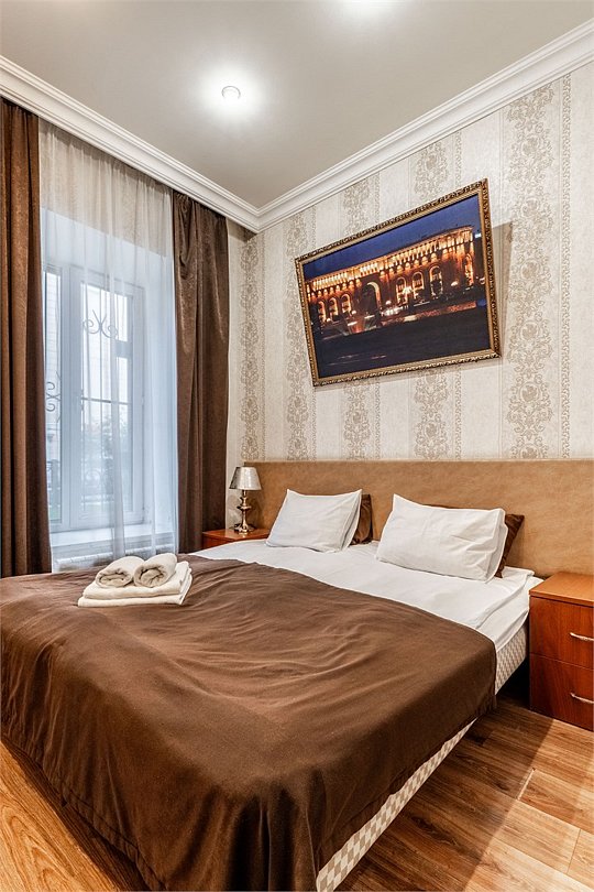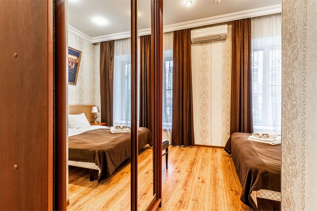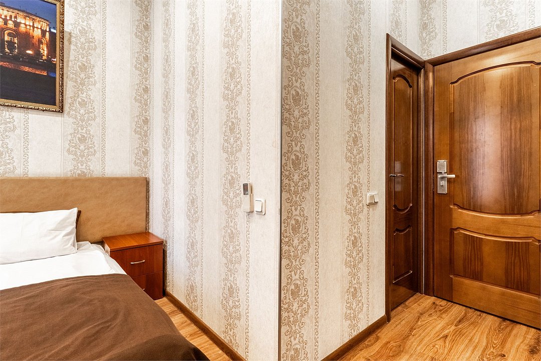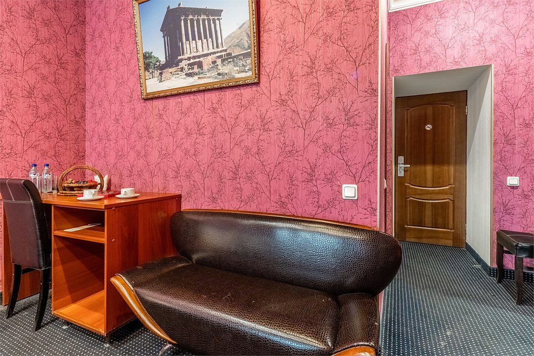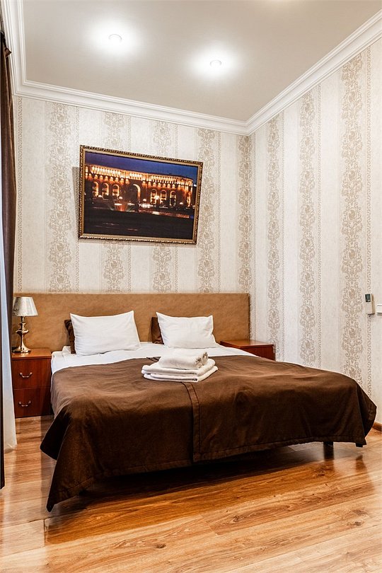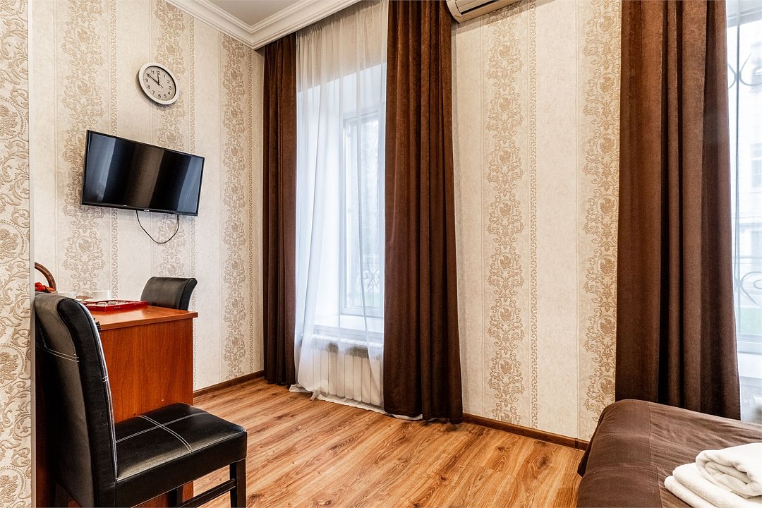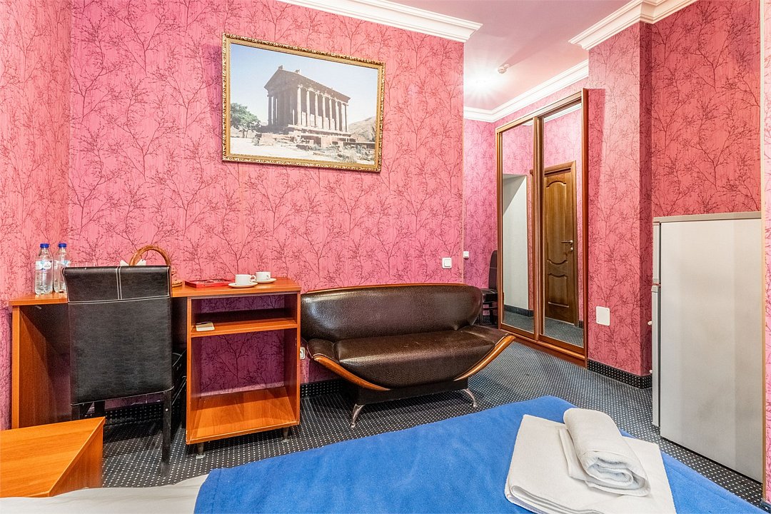 Однокомнатный номер для двоих со всеми необходимыми удобствами. Широкая двуспальная кровать, либо 2 раздельные кровати, шкаф, стол, стул, кондиционер, плазменный большой телевизор, туалетная комната со своим душем и туалетом. В номере так же есть холодильник, небольшой набор посуды, фен, сейф. Банные полотенца и косметические средства, ложка для обуви.Услуги и удобства