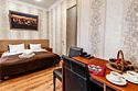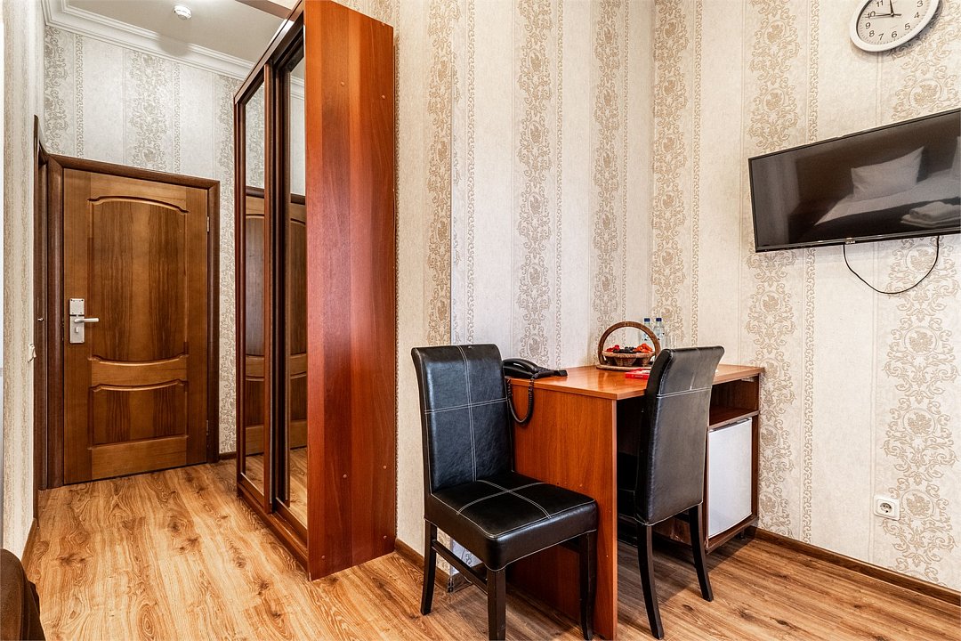 Однокомнатный номер для двоих со всеми необходимыми удобствами. Широкая двуспальная кровать, либо 2 раздельных кровати шкаф, стол, стул, кондиционер, плазменный большой телевизор, туалетная комната со своим душем и туалетом. В номере так же есть холодильник, небольшой набор посуды, фен, сейф. Банные полотенца и косметические средства, ложка для обуви.Услуги и удобства
