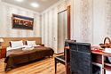 Выберите для комфортного отдыха роскошный номер в 40 кв. м., оформленный в золотисто-коричневой гамме, в классическом стиле с камином, который согреет, если стало зябко и создаст особую атмосферу уюта ночью. Широкая кровать и раскладывающийся 2-х спальный диван позволят с комфортом разместиться семье из 4 человек. Номер оборудован кондиционером, большим плазменным телевизором и холодильником. В номере предусмотрен сейф для хранения ценностей. В ванной комнате для вашего удобства есть фен, банные полотенца, халат и косметические средства.Услуги и удобства